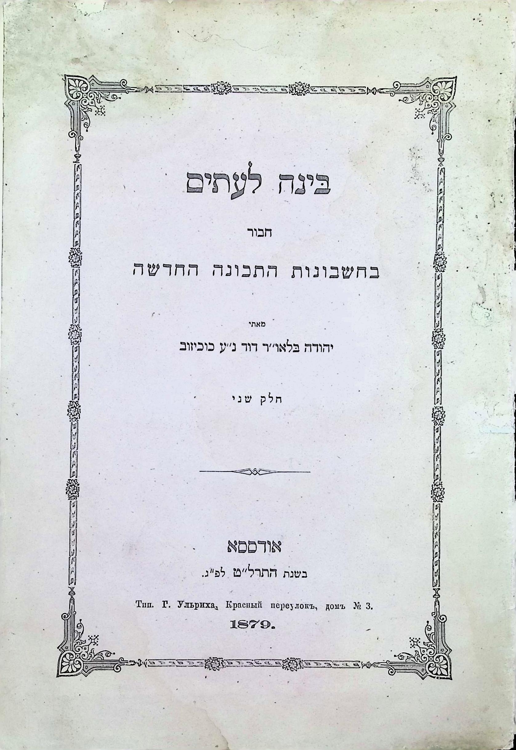 Біна ле-етім Книги, Роки Назва: Біна ле-етім Дата: 1879 р. Опис: Давид Кокізов. Біна ле-етім (Мудрість часів). Одеса. Том ІІ Інвентарний номер: РКГ-42 КН-5943