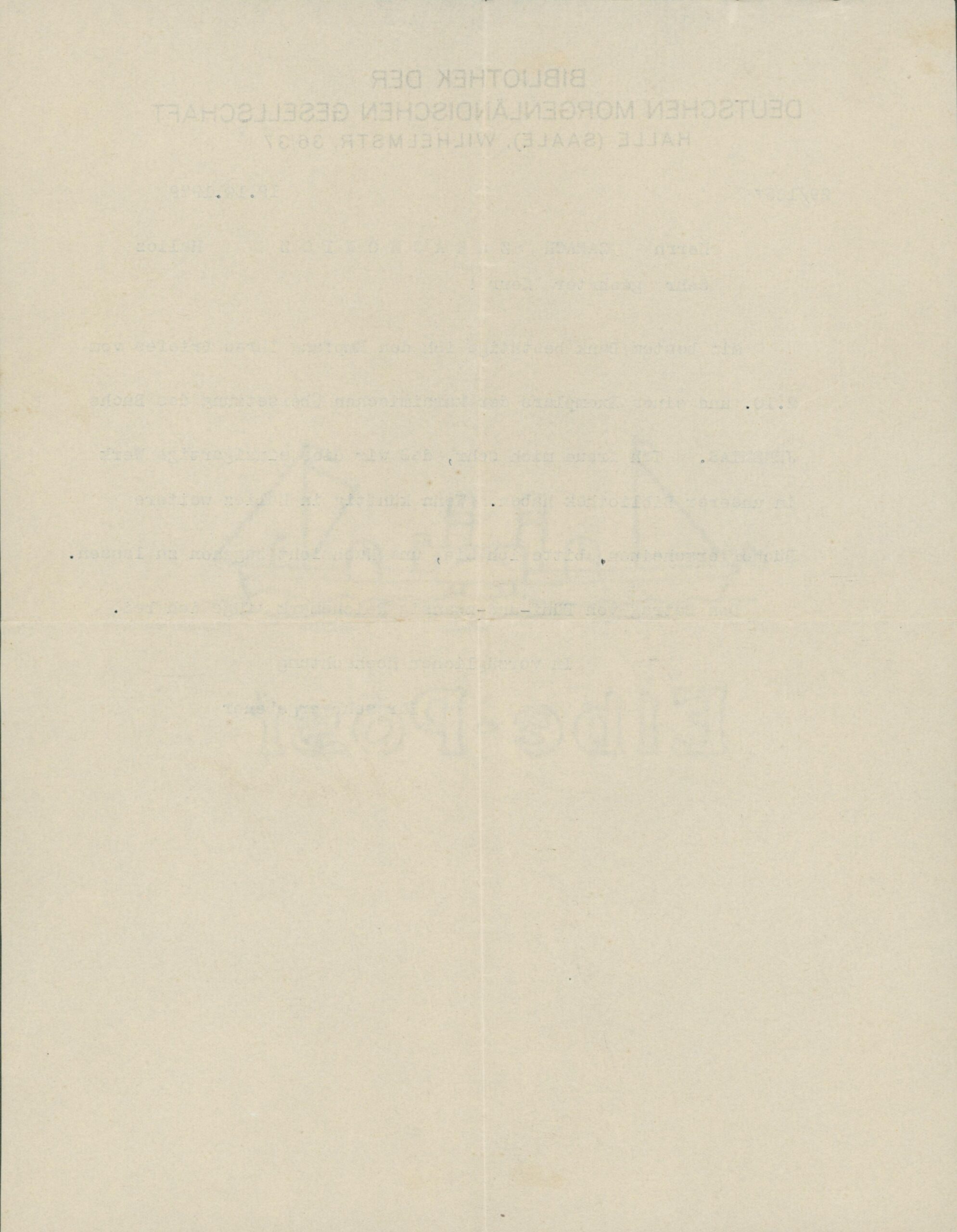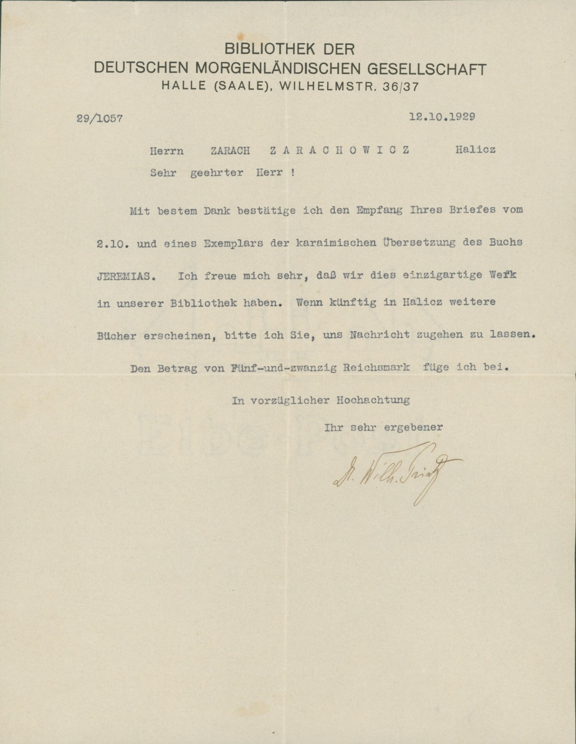 Letter from the Halle Library No. 2 Epistolary heritage Title: Letter from the Halle Library No. 2 Date: October 12, 1929 Description: Letter to Zarach Zarachovich from the Halle Library (Germany) signed by Dr. Wilhelm Printz Inventory number: none