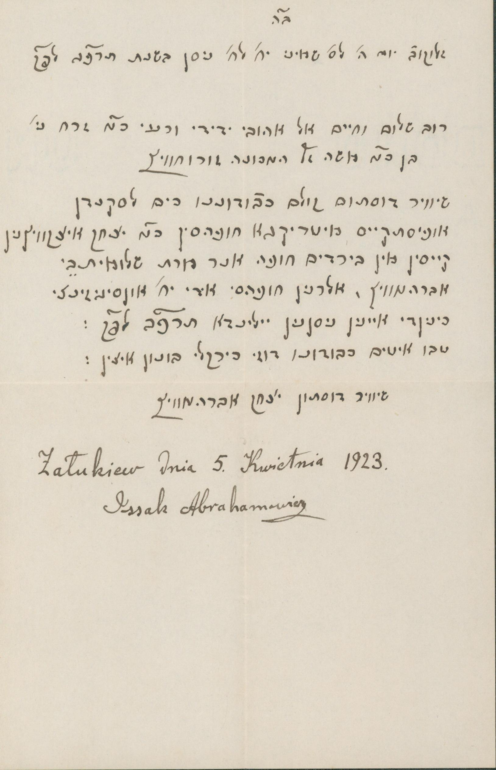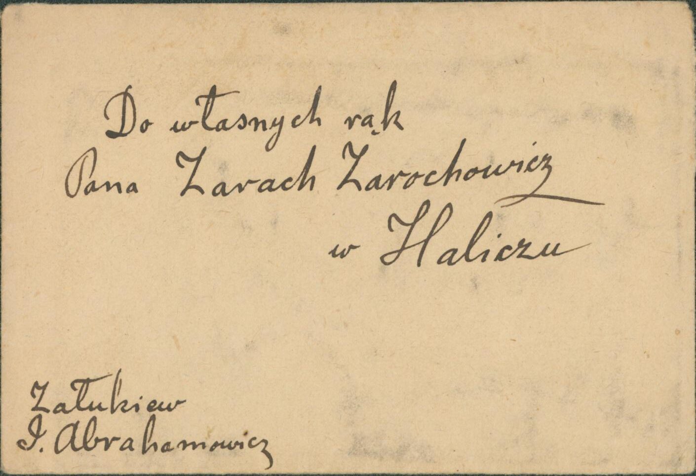 Description: Letter marked “personal” to Zarakh Zarakhovich in Halych from Izak Abrahamovich from the village of Zalukva, text of the letter in Hebrew.