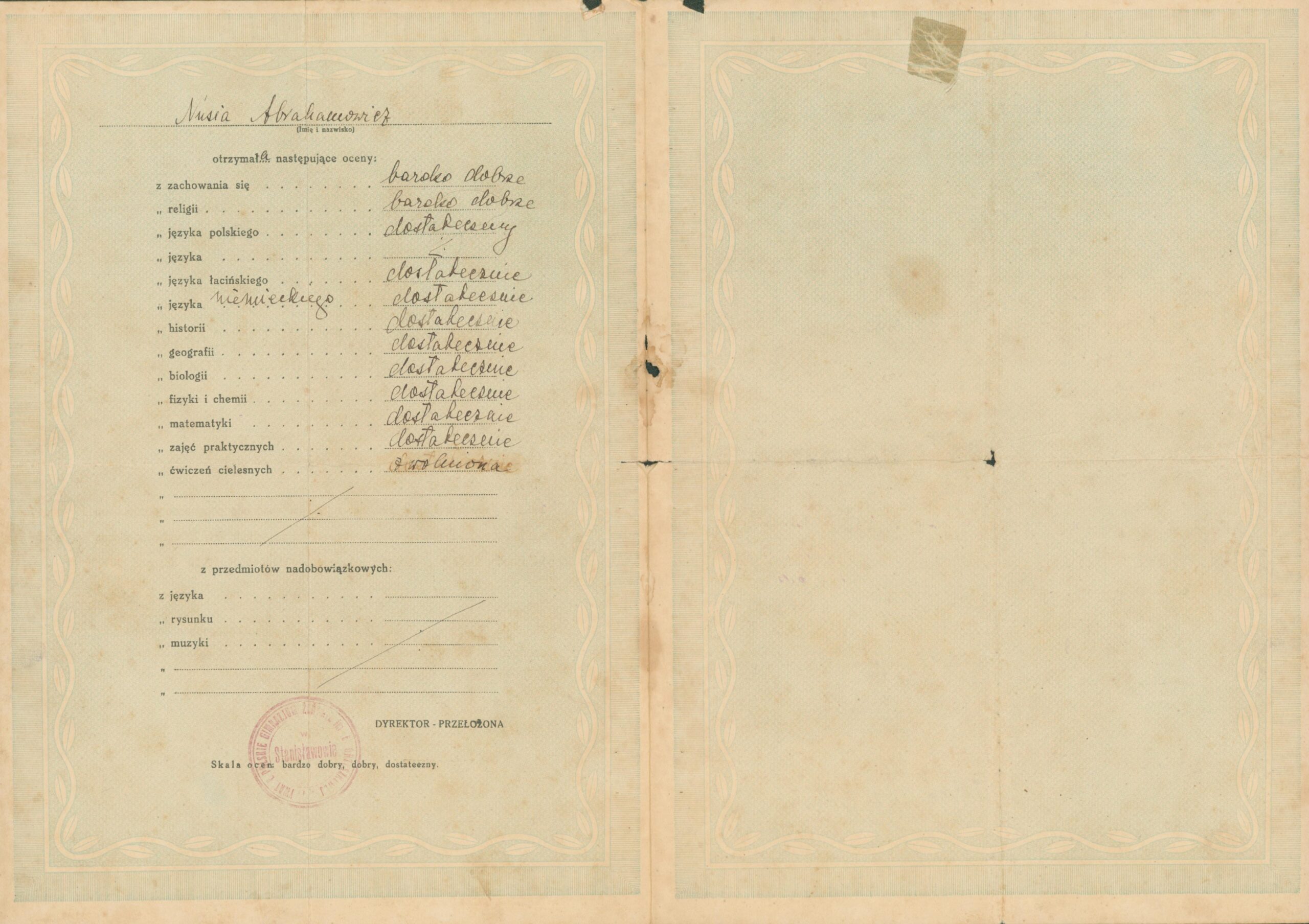 School certificate of Nusi Abramovich Documents, Yers Title: School certificate of Nusi Abramovich Date: June 21, 1938 Description: School certificate of Nusi Abramovich, a student at the private gymnasium in Stanislavov Inventory number: НЗДГ KН-9835 AДР-36