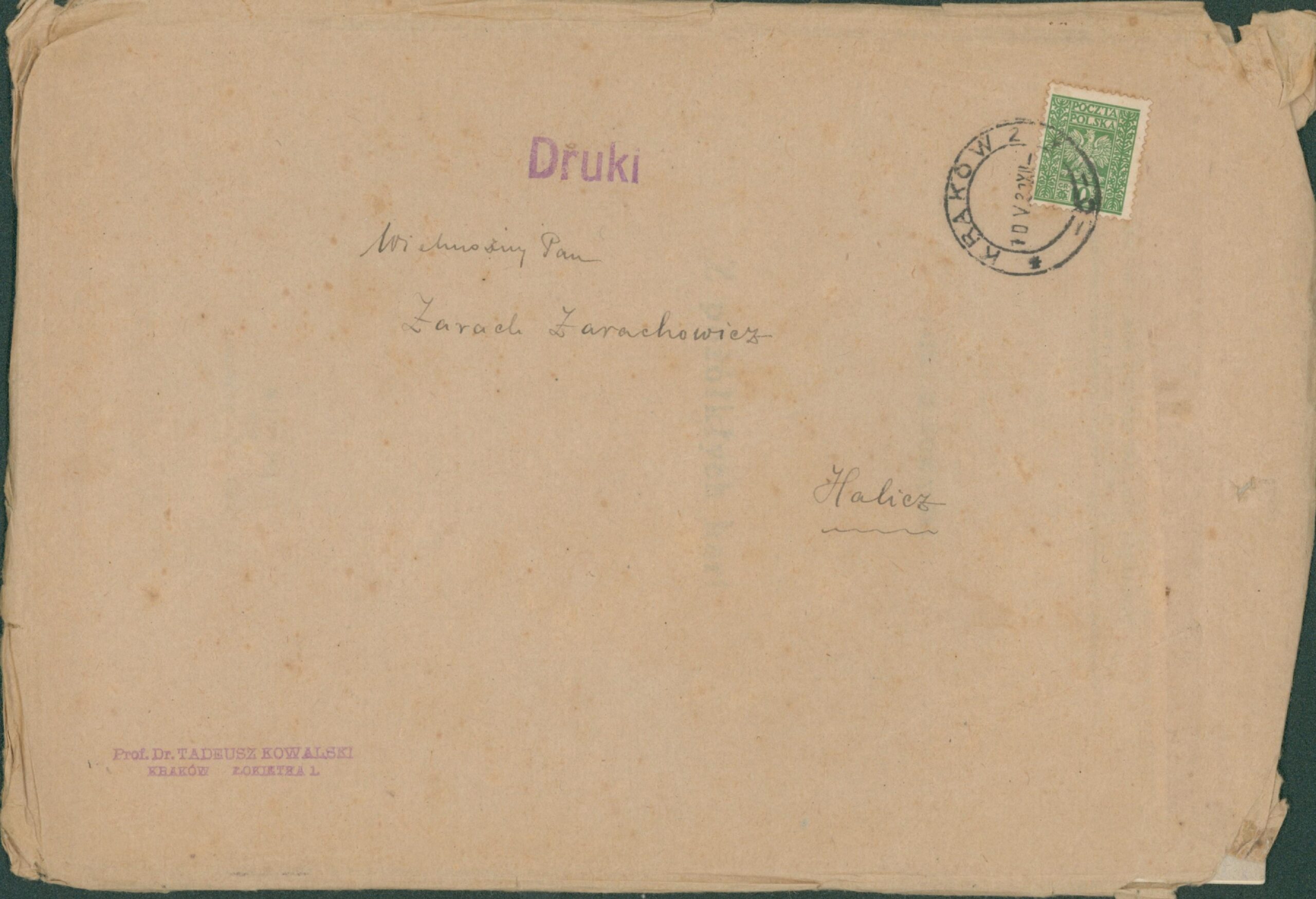 Назва: Лист з окремим відбитком статті від Тадеуша Ковальського до Зараха Зараховича