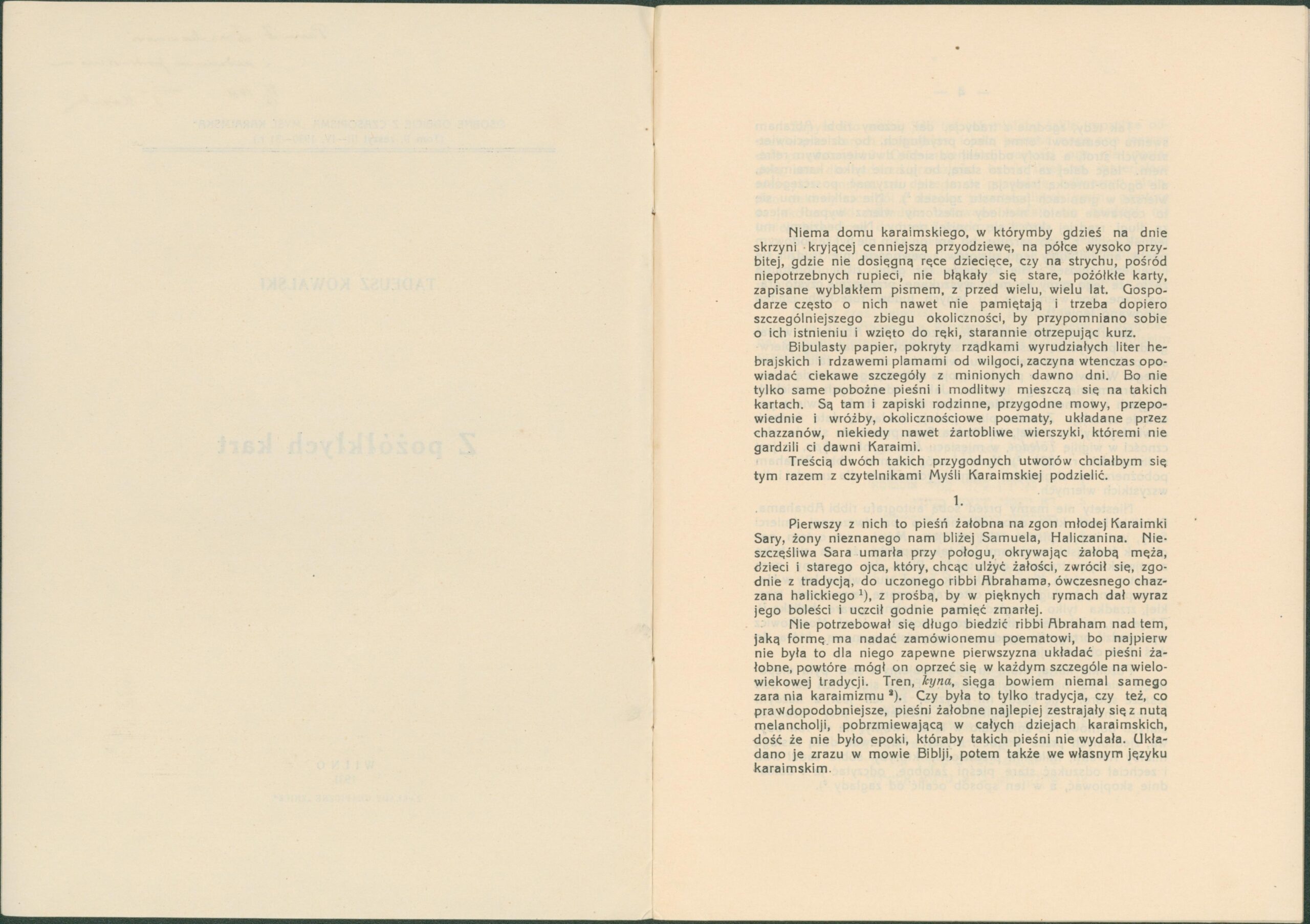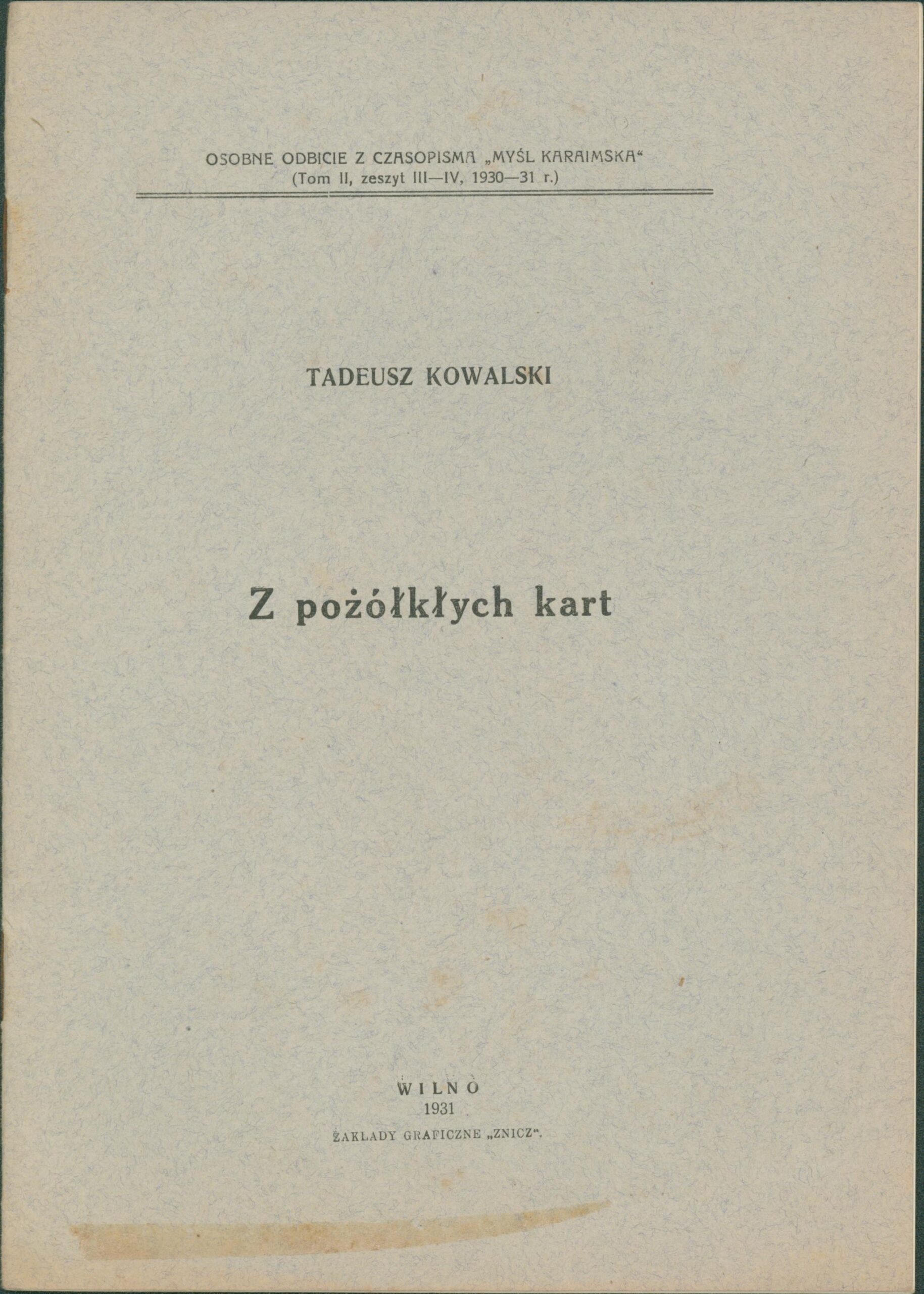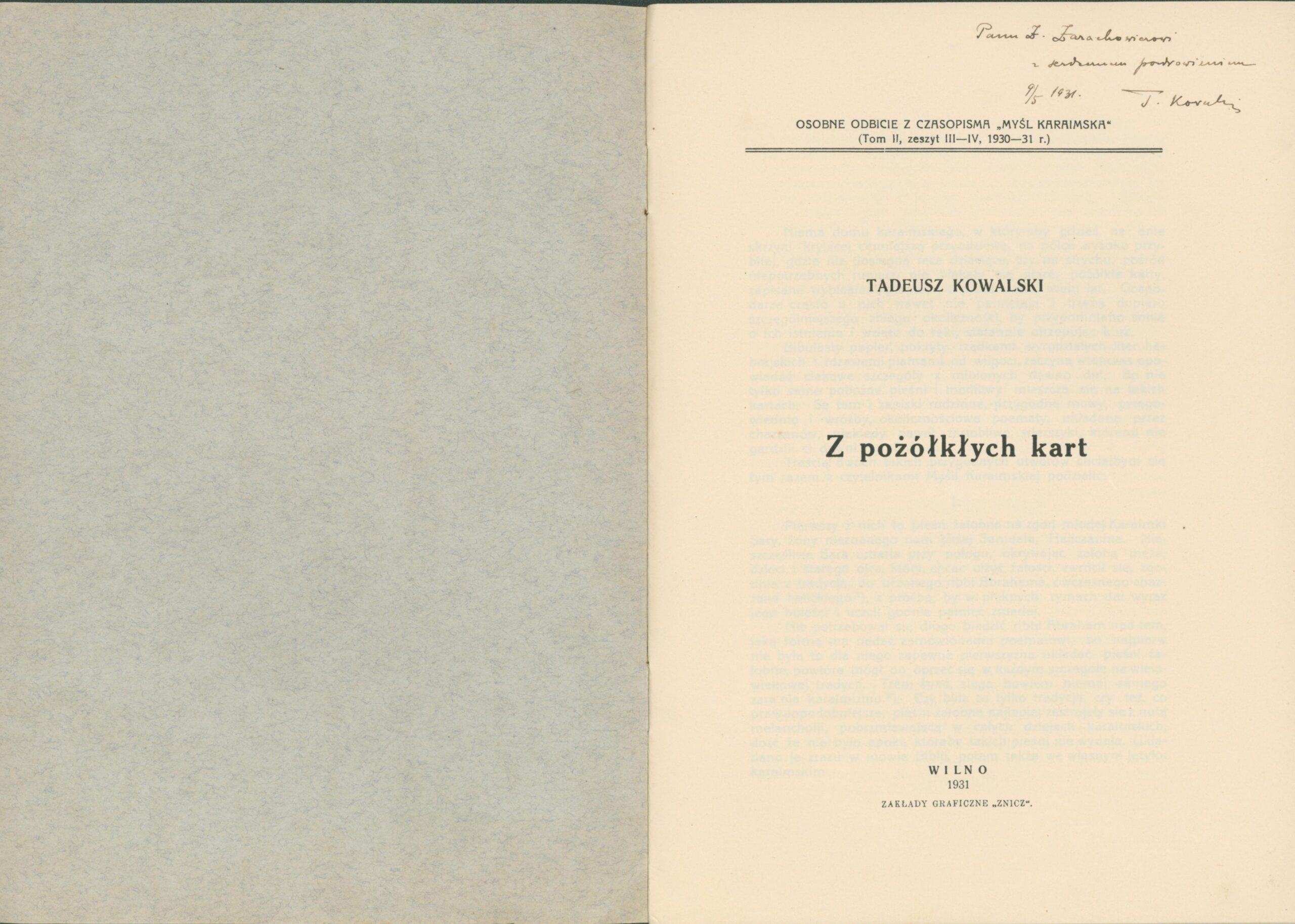 Опис: Лист адресований Зараху Зараховичу від Тадеуша Ковальського з окремим відбитком статті / Tadeusz Kowalski. Z pożółkłych kart. Myśl Karaimska. Tom II Zeszyt III-IV