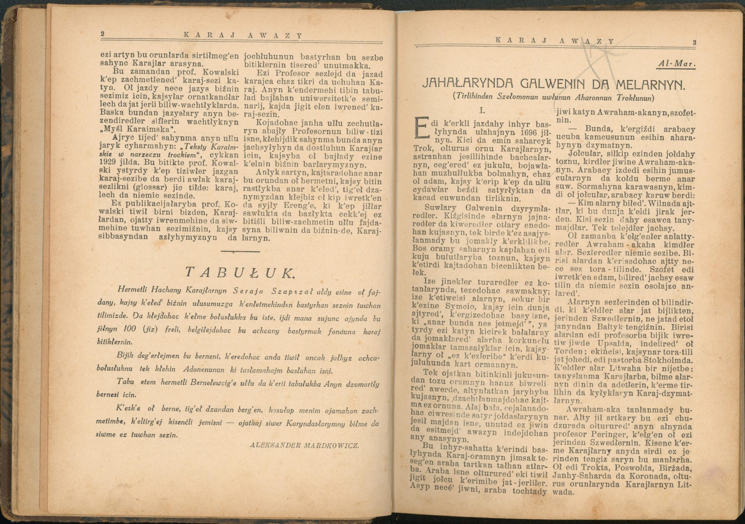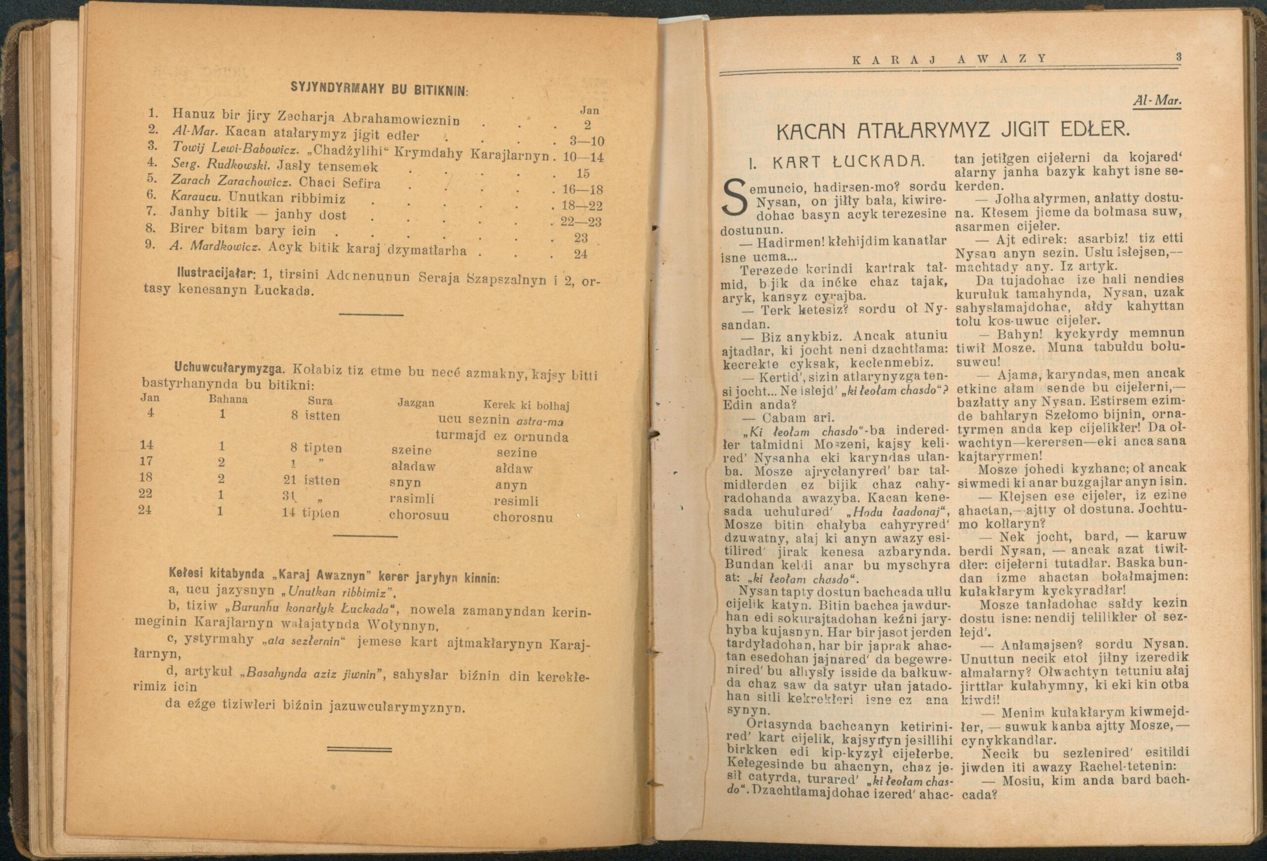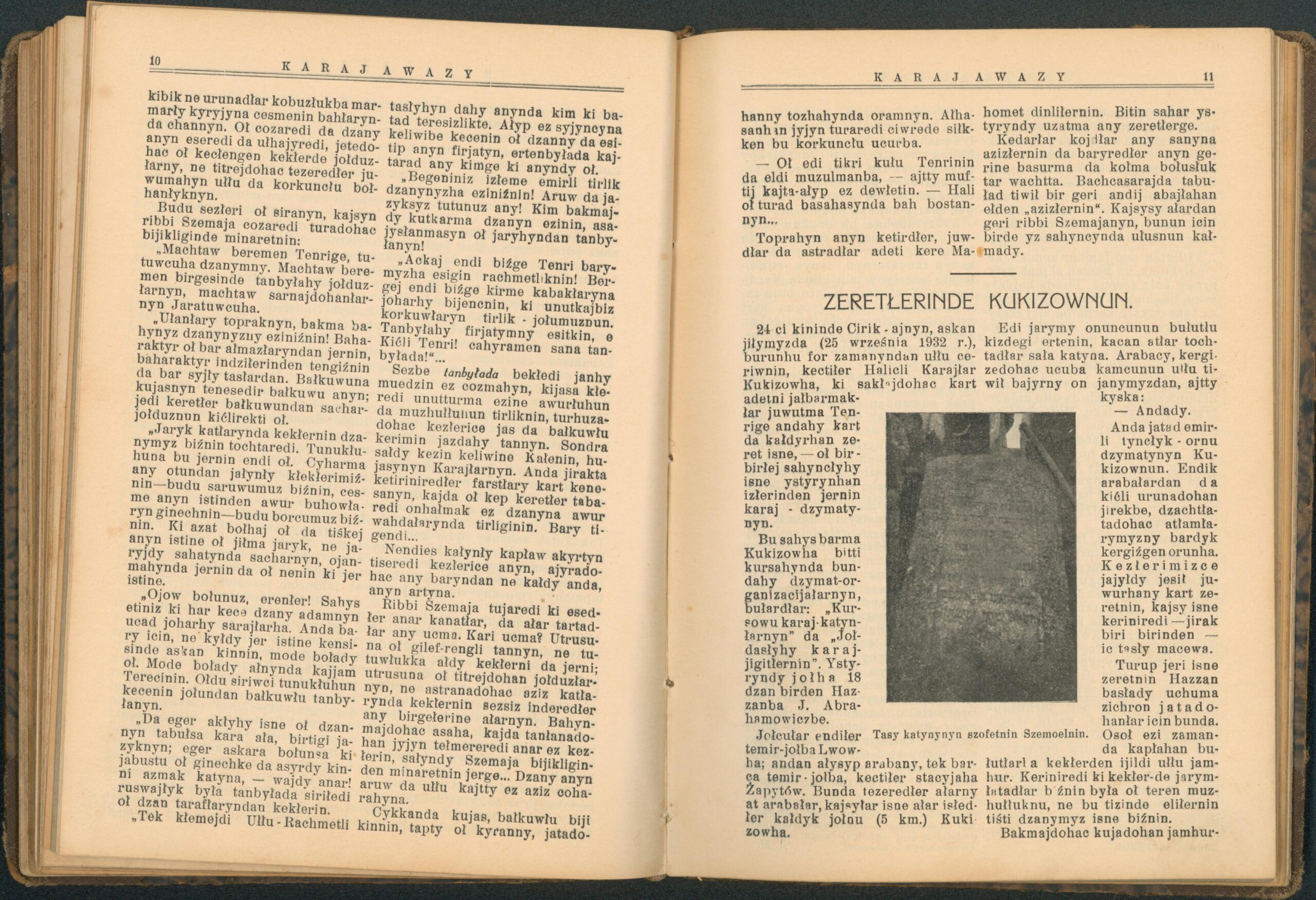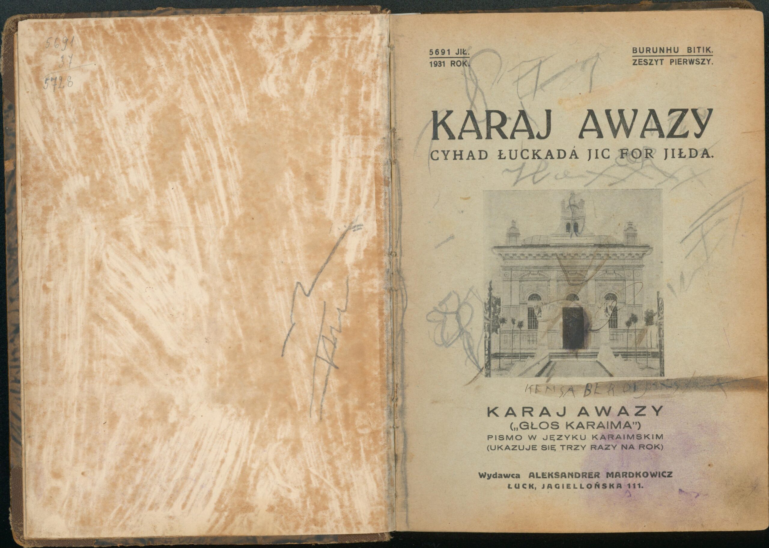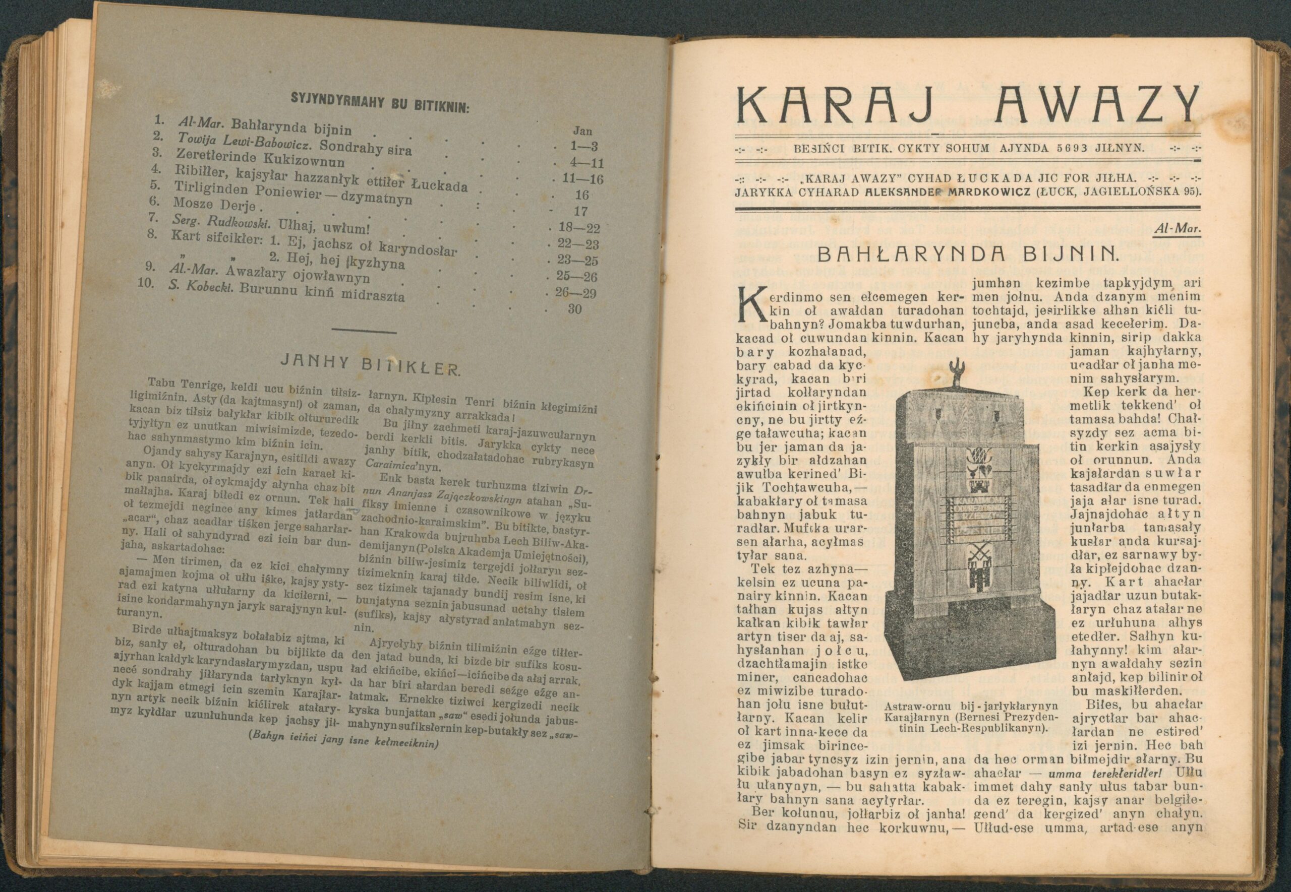 Опис: “Karaj Awazy” – єдиний часопис, що публікувався караїмською мовою. Заснований і виданий за кошти Олександра Мардковича (1875-1944) – караїмського громадського і культурного діяча, юриста, популяризатора караїмської мови. Видавався в Луцьку з 1931-1938 роки. Всього вийшло друком 12 номерів часопису.