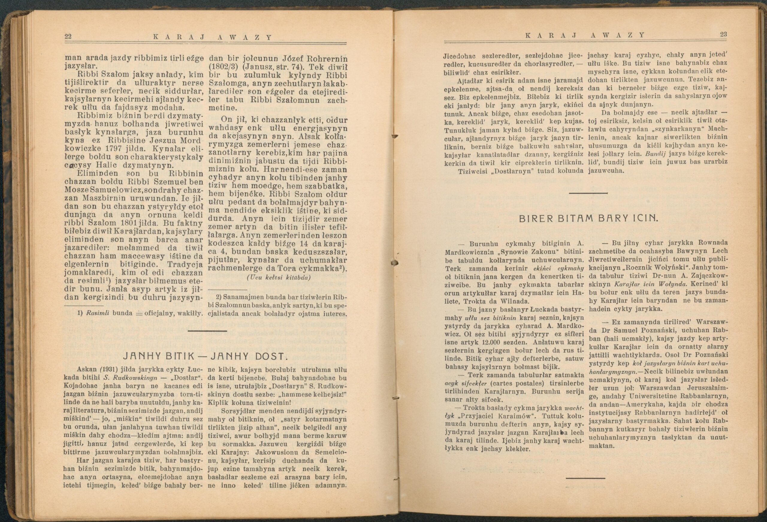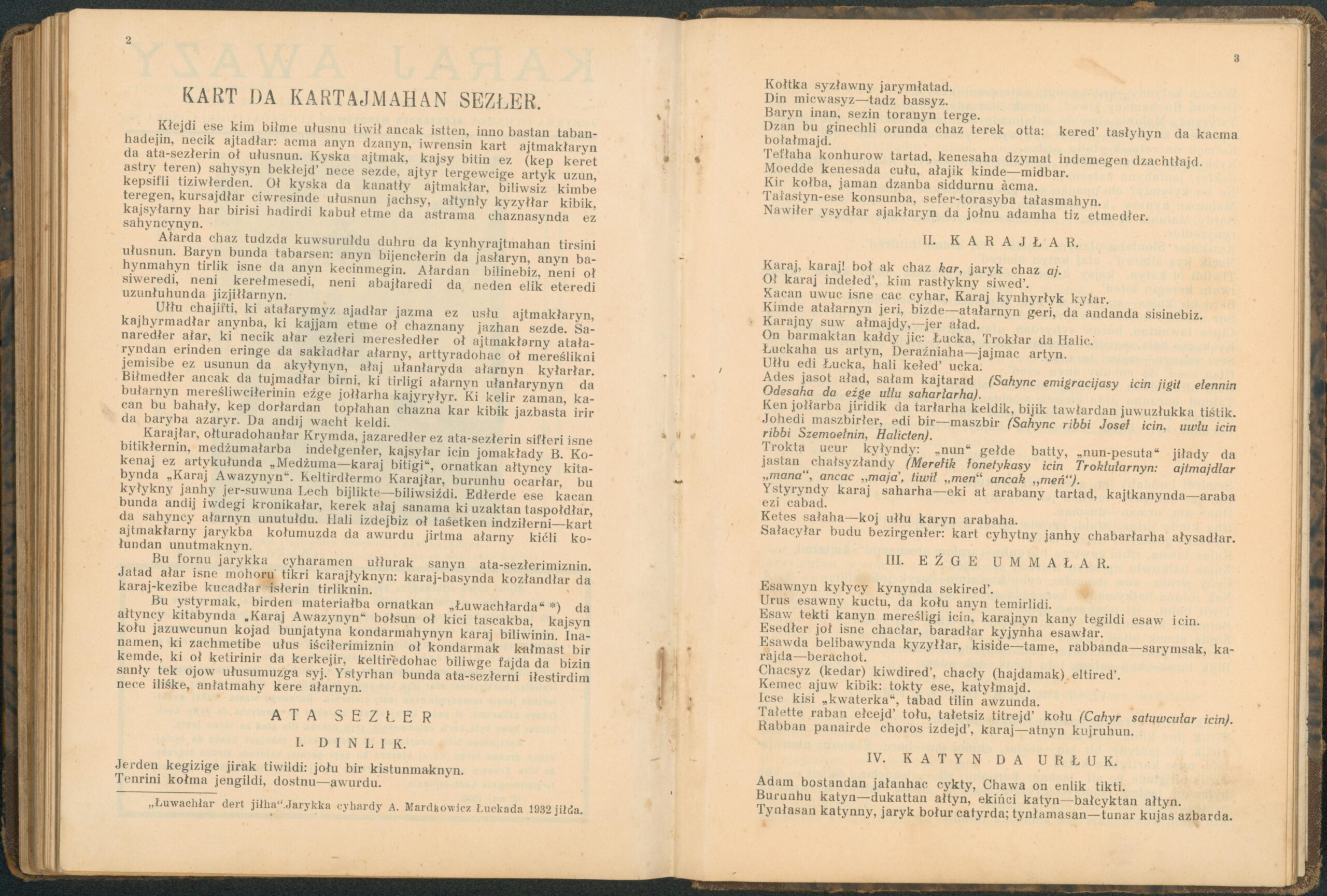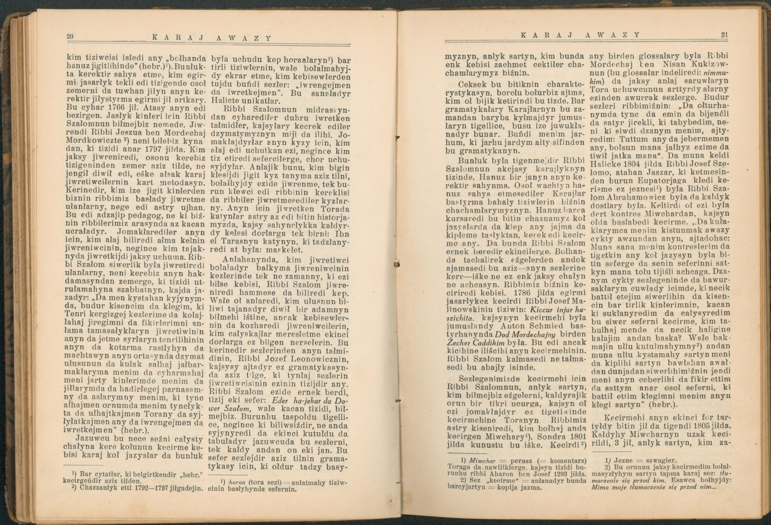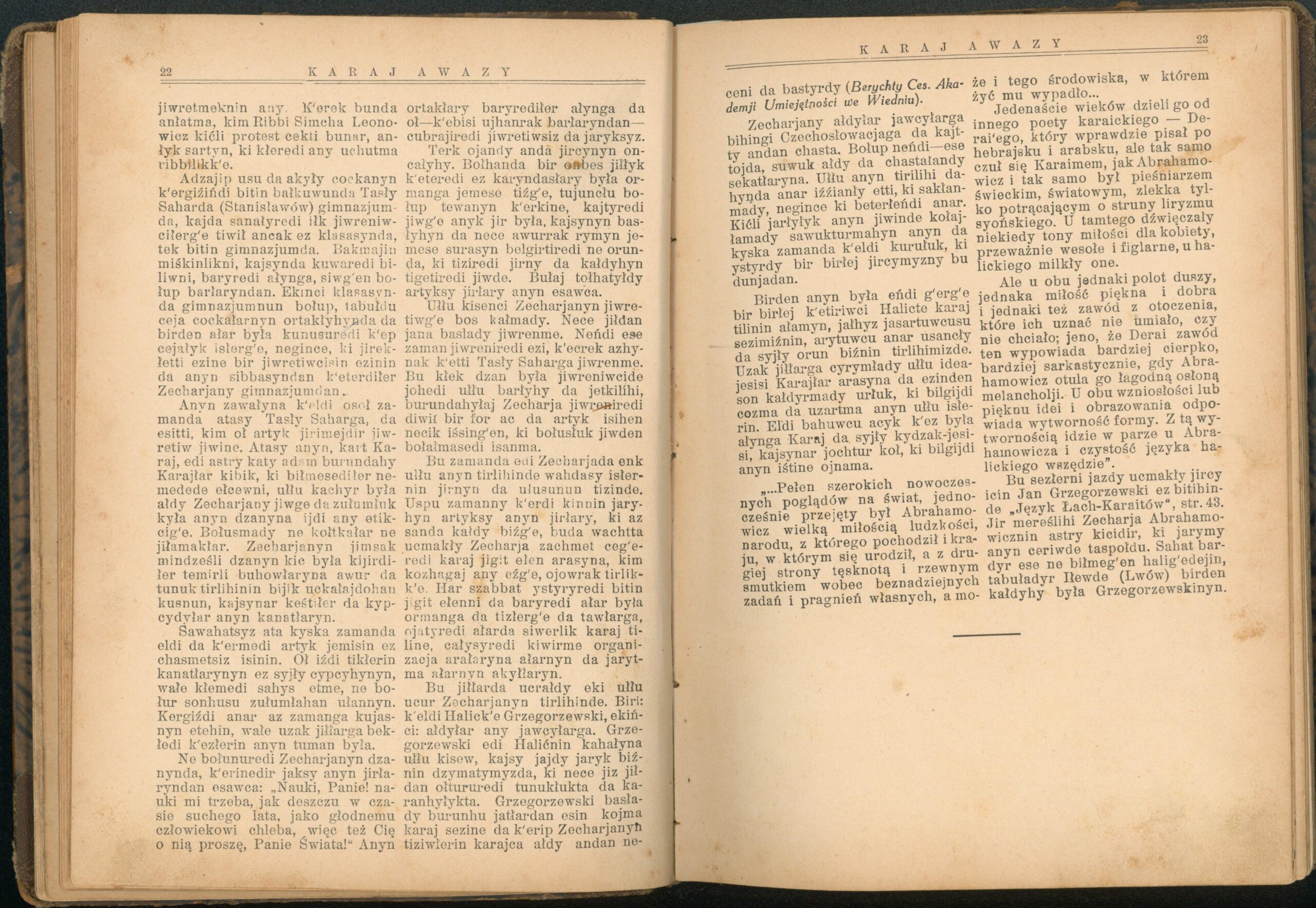 Опис: “Karaj Awazy” – єдиний часопис, що публікувався караїмською мовою. Заснований і виданий за кошти Олександра Мардковича (1875-1944) – караїмського громадського і культурного діяча, юриста, популяризатора караїмської мови. Видавався в Луцьку з 1931-1938 роки. Всього вийшло друком 12 номерів часопису.