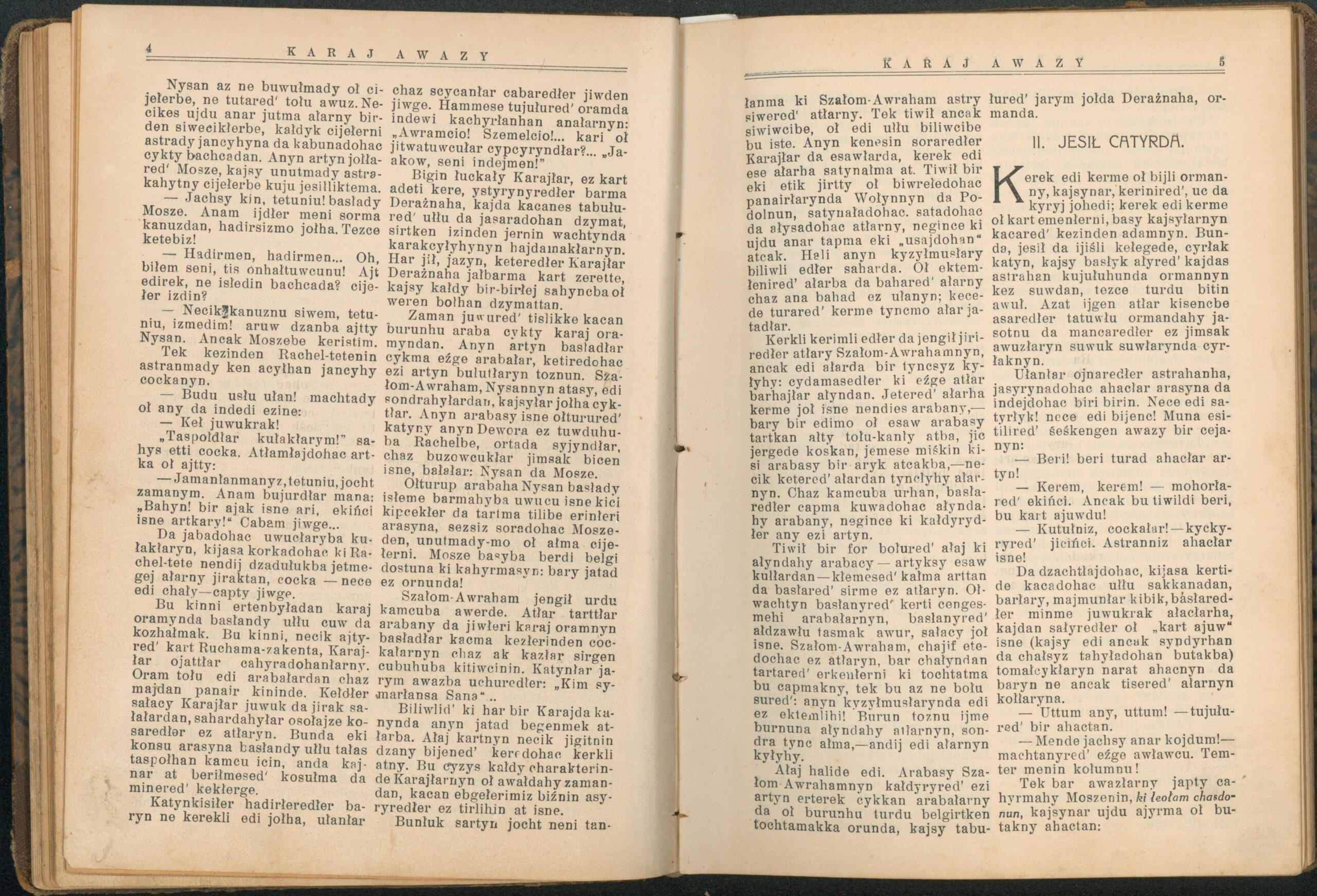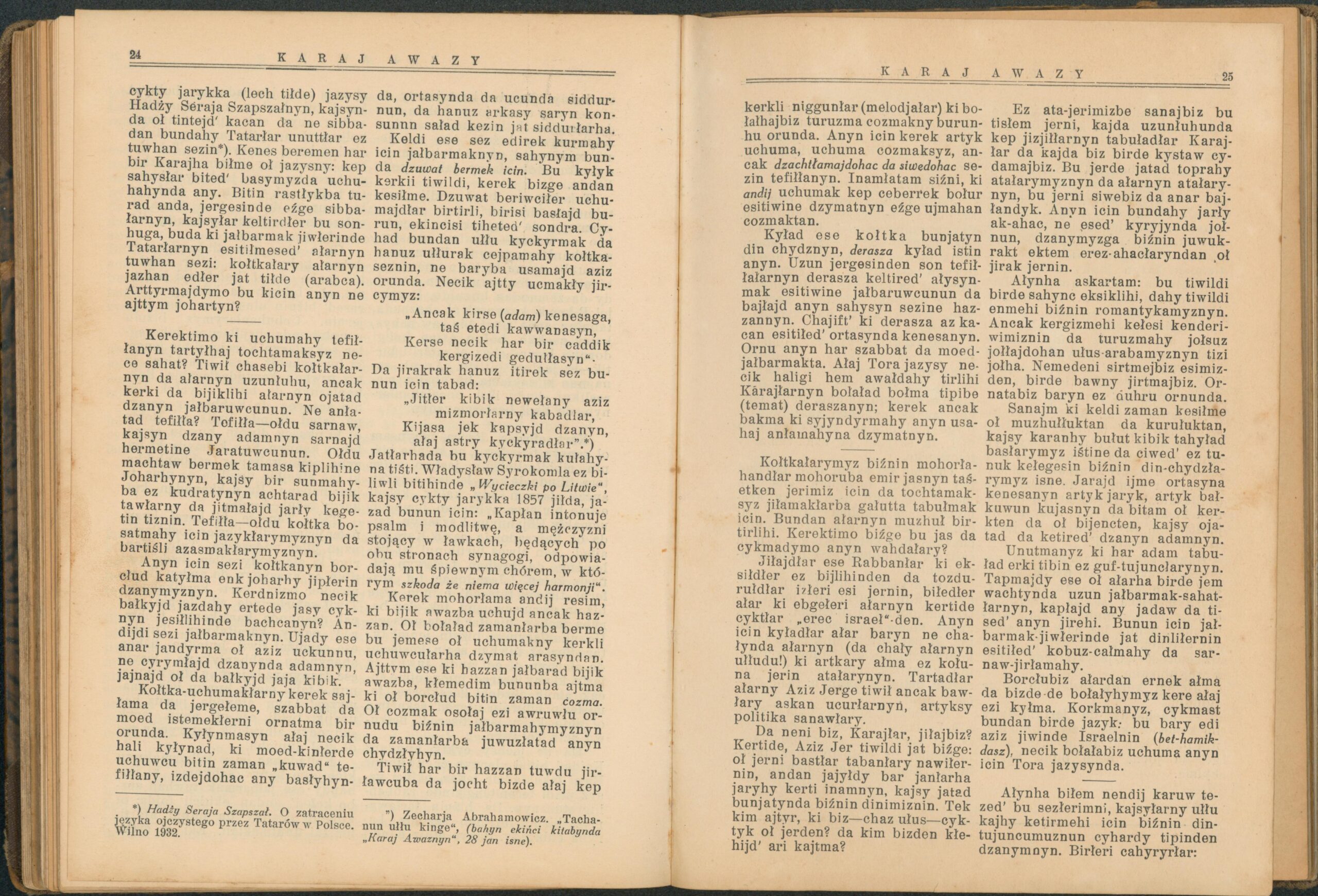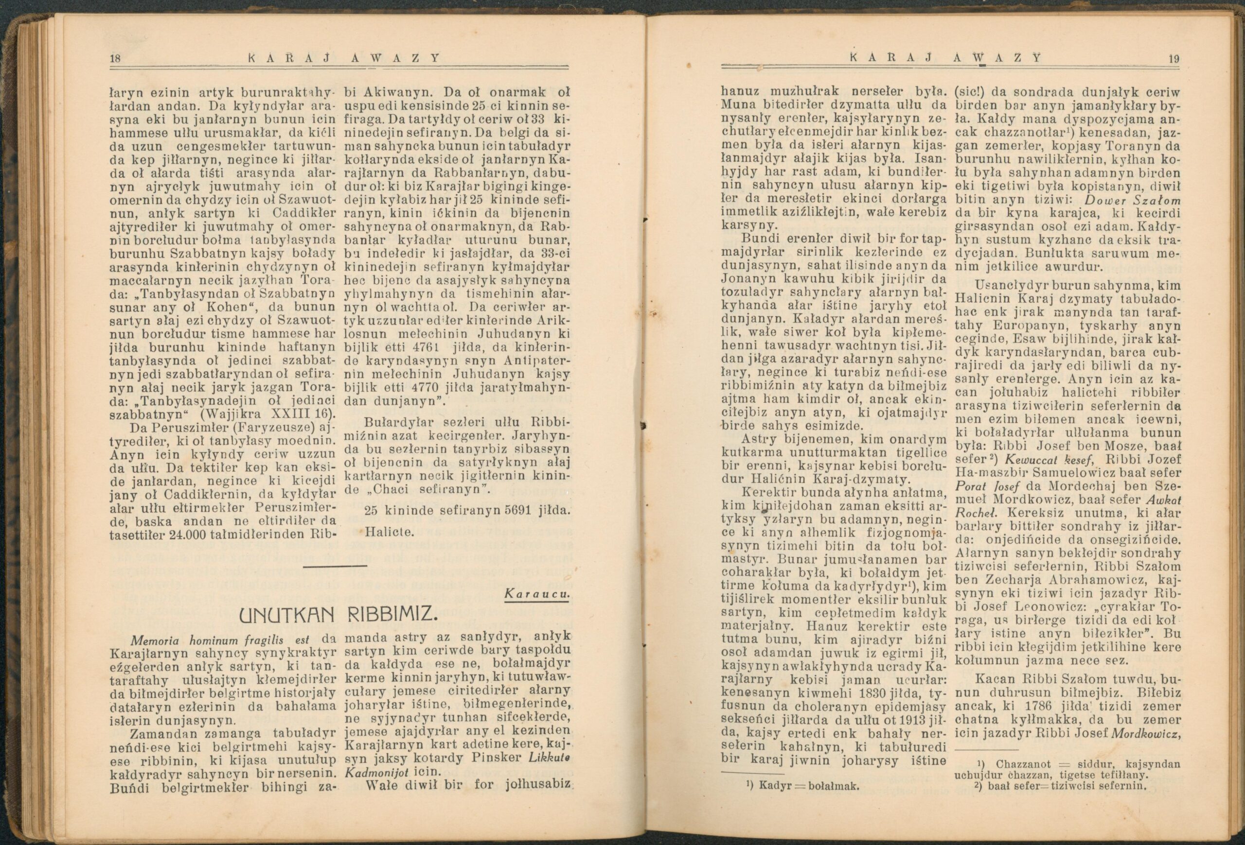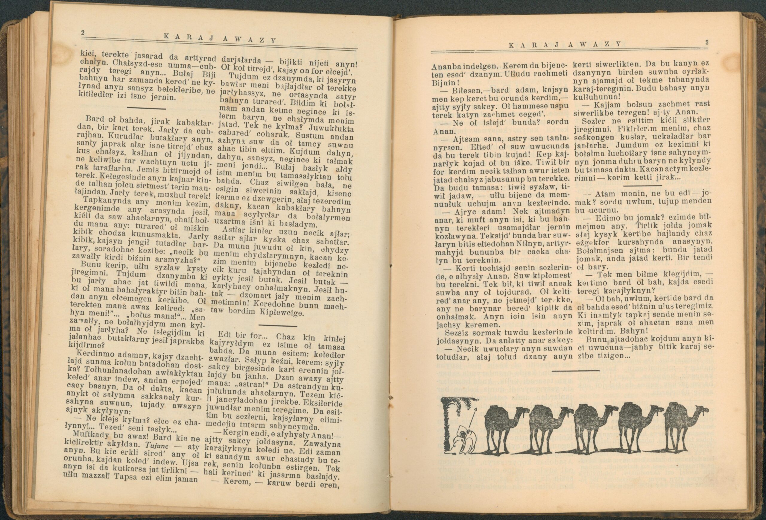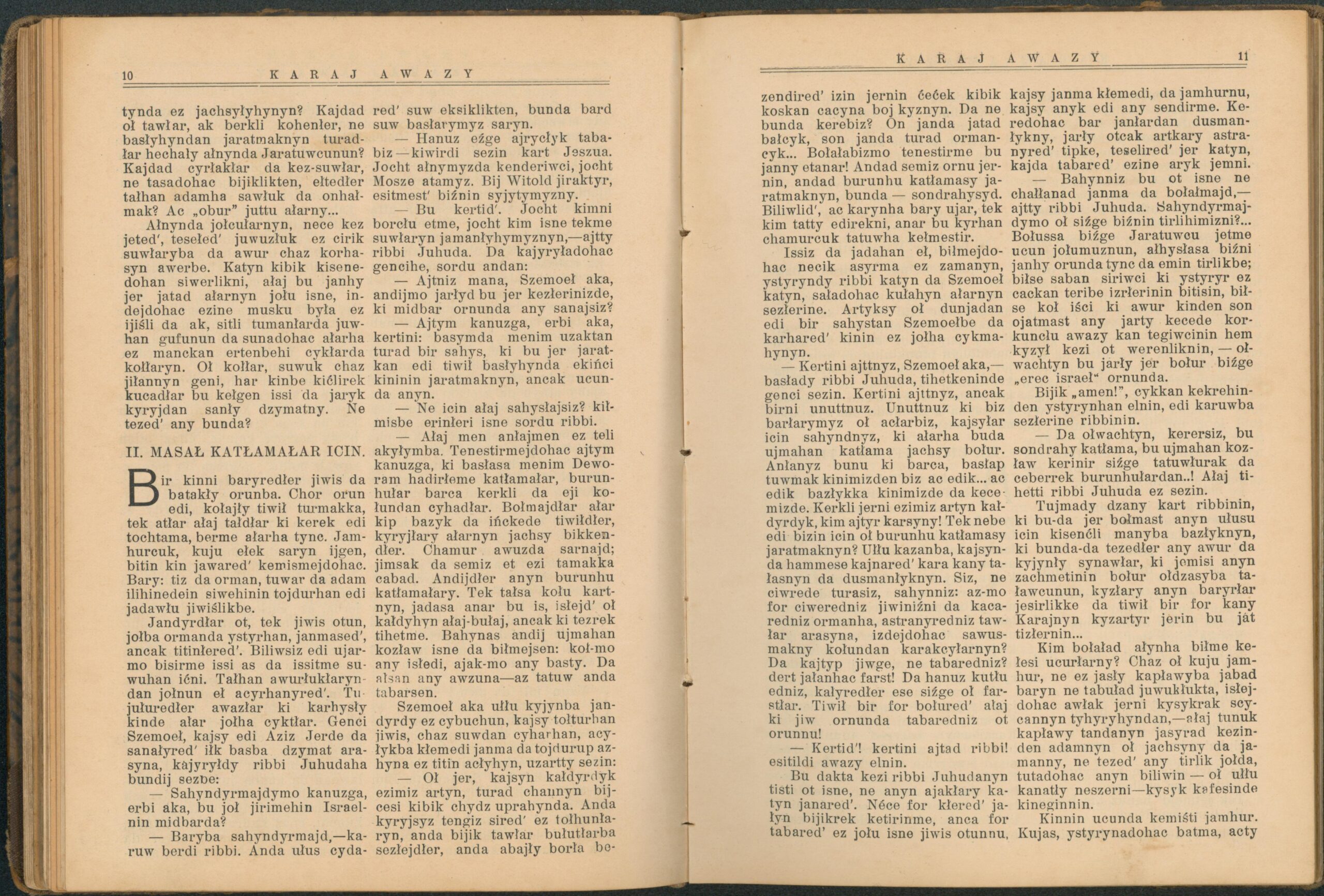 Опис: “Karaj Awazy” – єдиний часопис, що публікувався караїмською мовою. Заснований і виданий за кошти Олександра Мардковича (1875-1944) – караїмського громадського і культурного діяча, юриста, популяризатора караїмської мови. Видавався в Луцьку з 1931-1938 роки. Всього вийшло друком 12 номерів часопису.