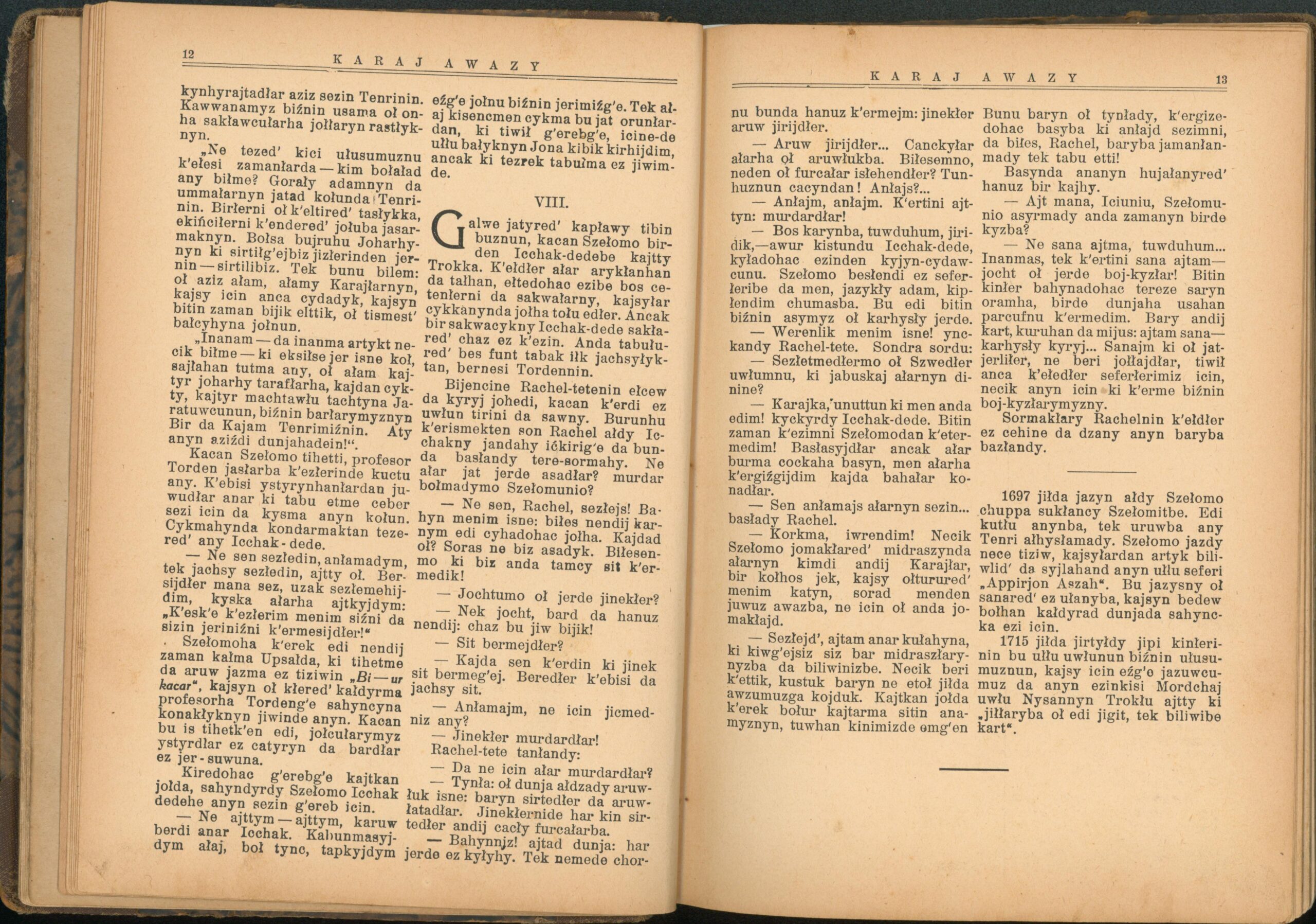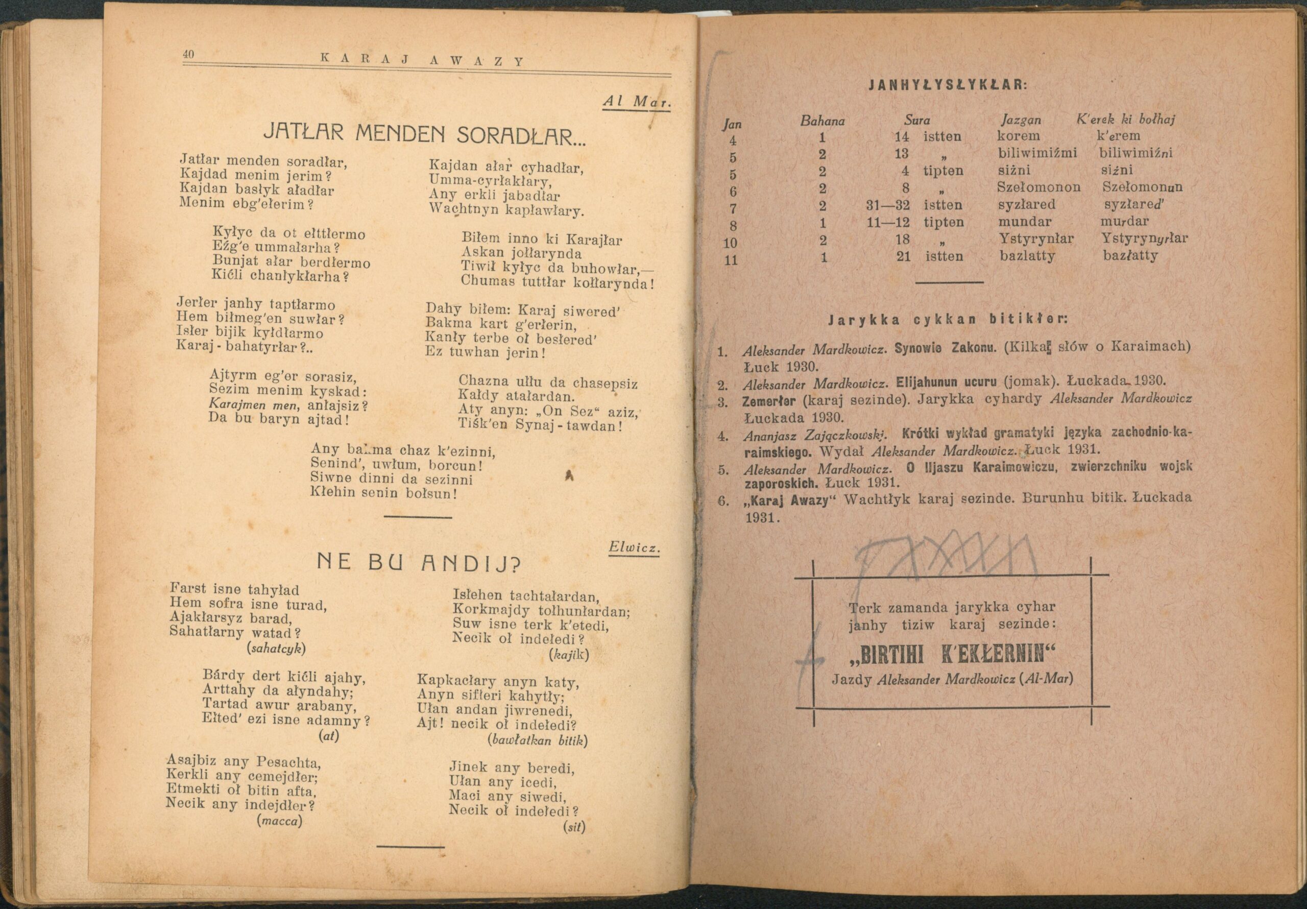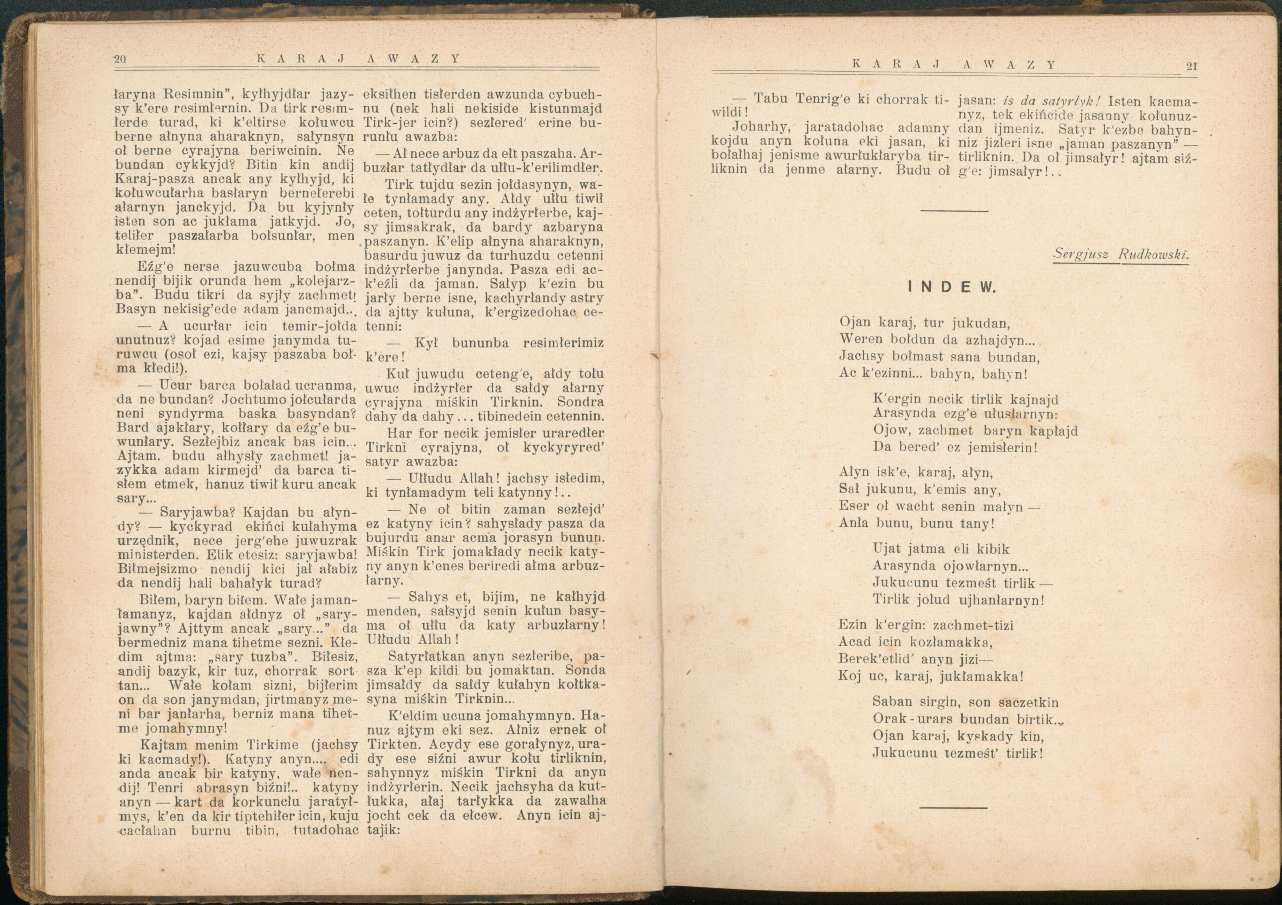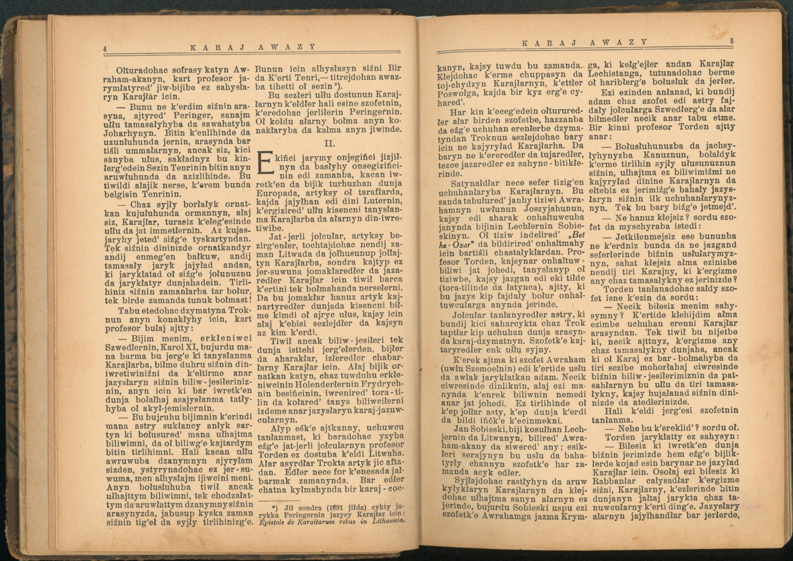 Опис: “Karaj Awazy” – єдиний часопис, що публікувався караїмською мовою. Заснований і виданий за кошти Олександра Мардковича (1875-1944) – караїмського громадського і культурного діяча, юриста, популяризатора караїмської мови. Видавався в Луцьку з 1931-1938 роки. Всього вийшло друком 12 номерів часопису.