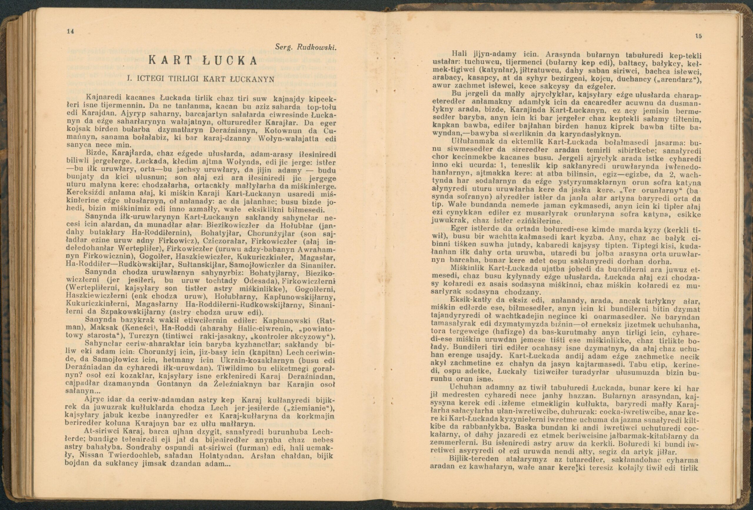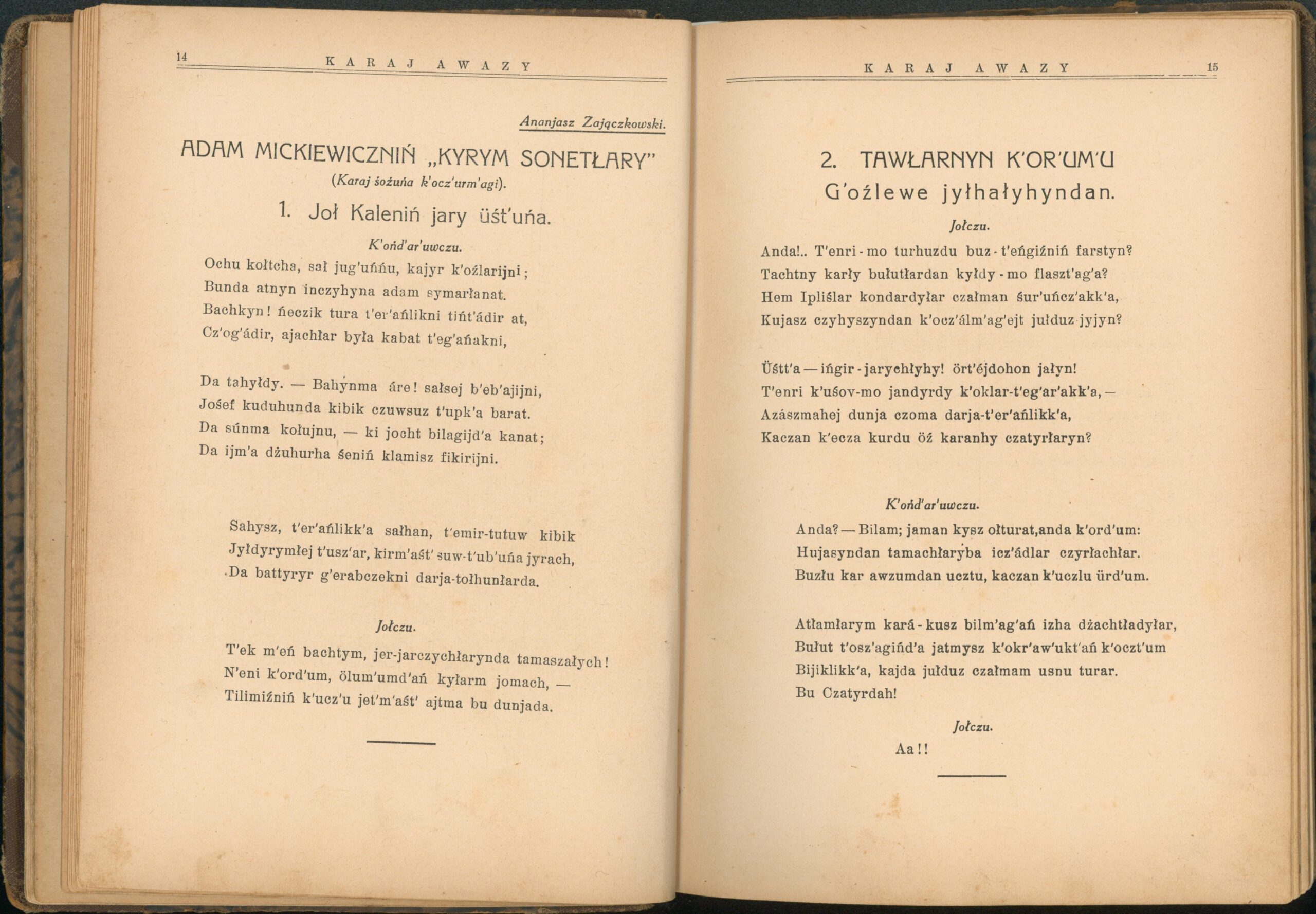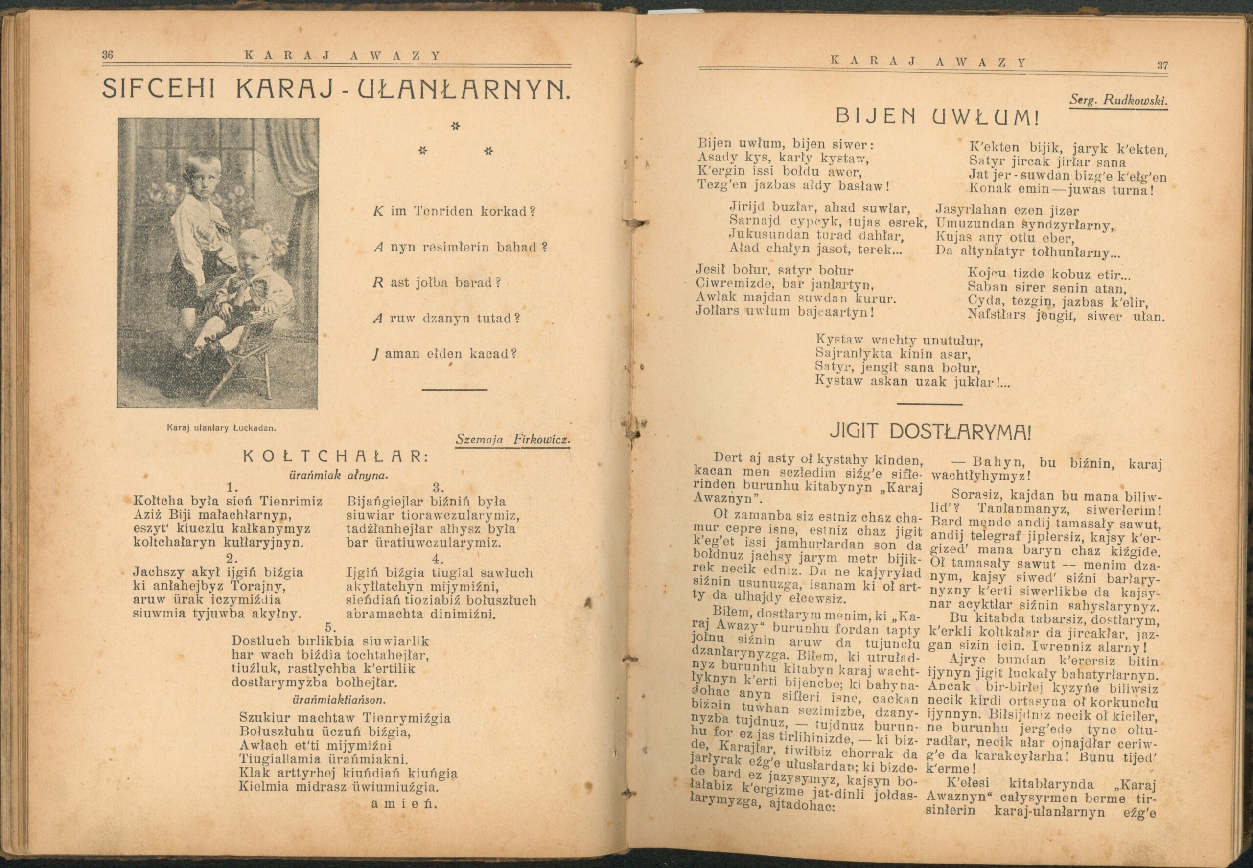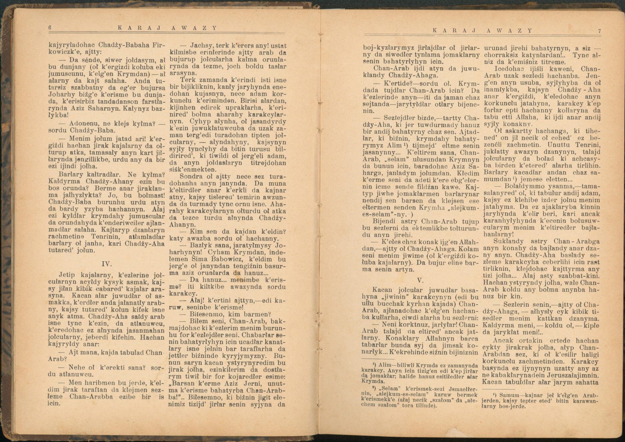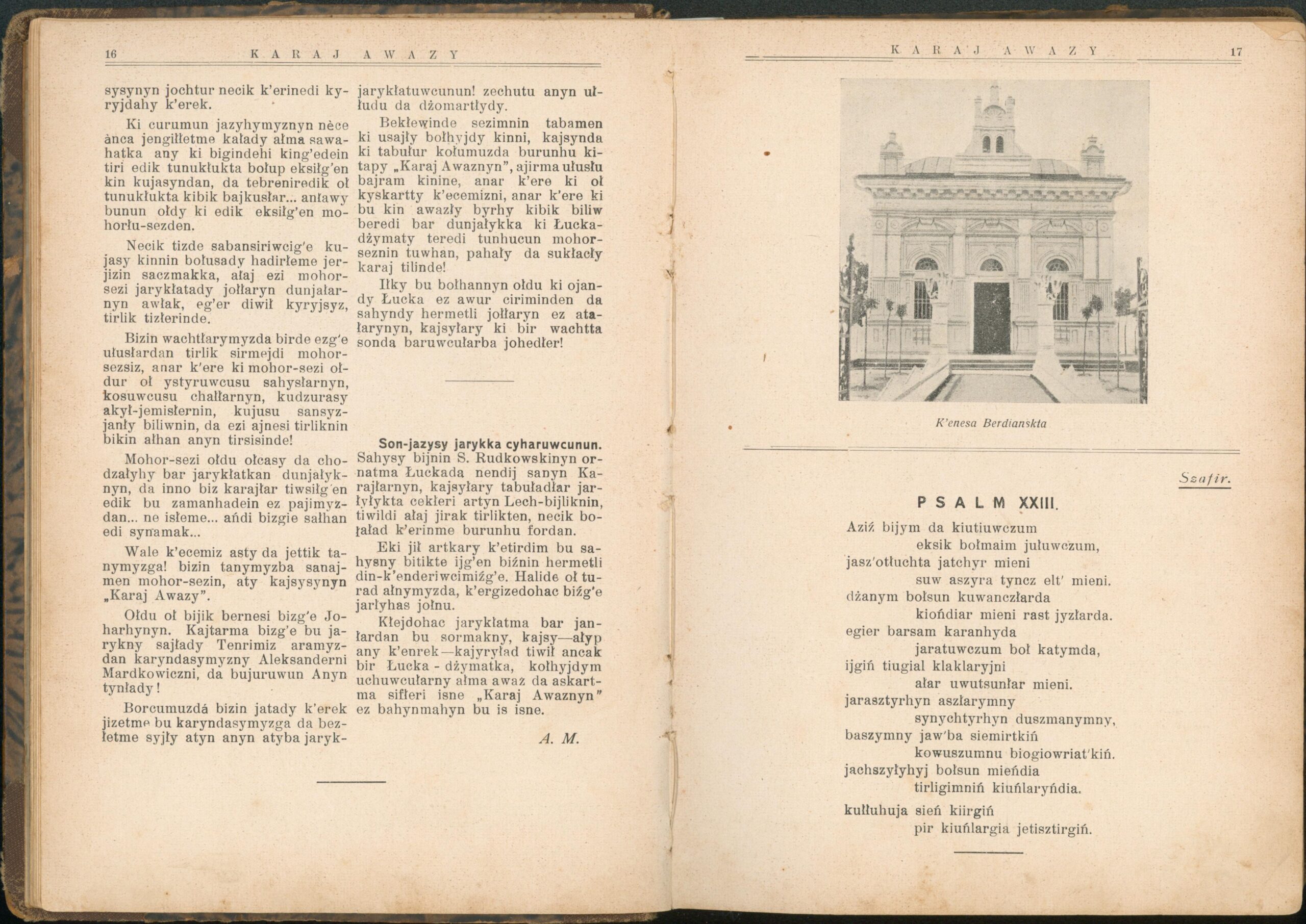 Опис: “Karaj Awazy” – єдиний часопис, що публікувався караїмською мовою. Заснований і виданий за кошти Олександра Мардковича (1875-1944) – караїмського громадського і культурного діяча, юриста, популяризатора караїмської мови. Видавався в Луцьку з 1931-1938 роки. Всього вийшло друком 12 номерів часопису.