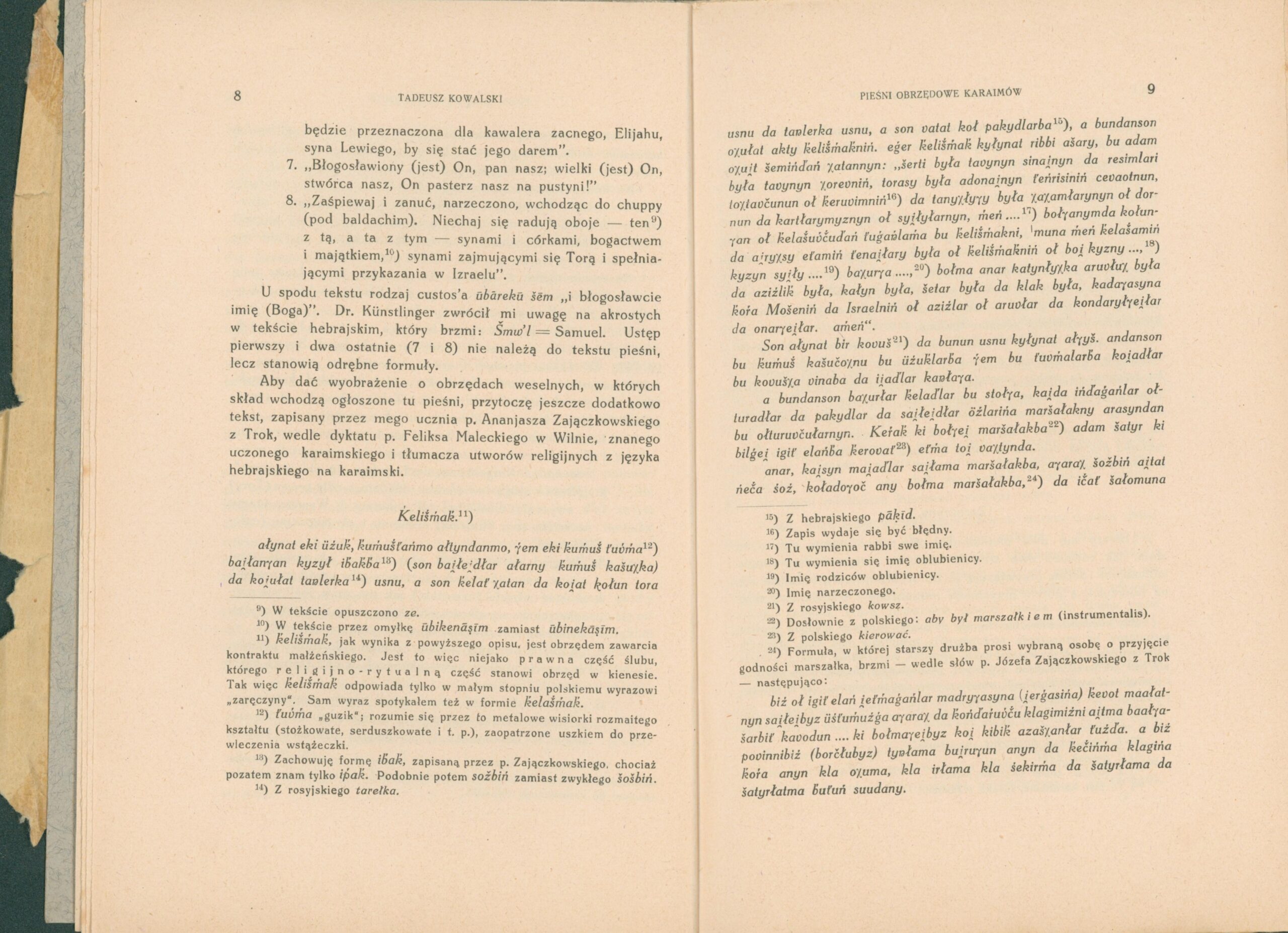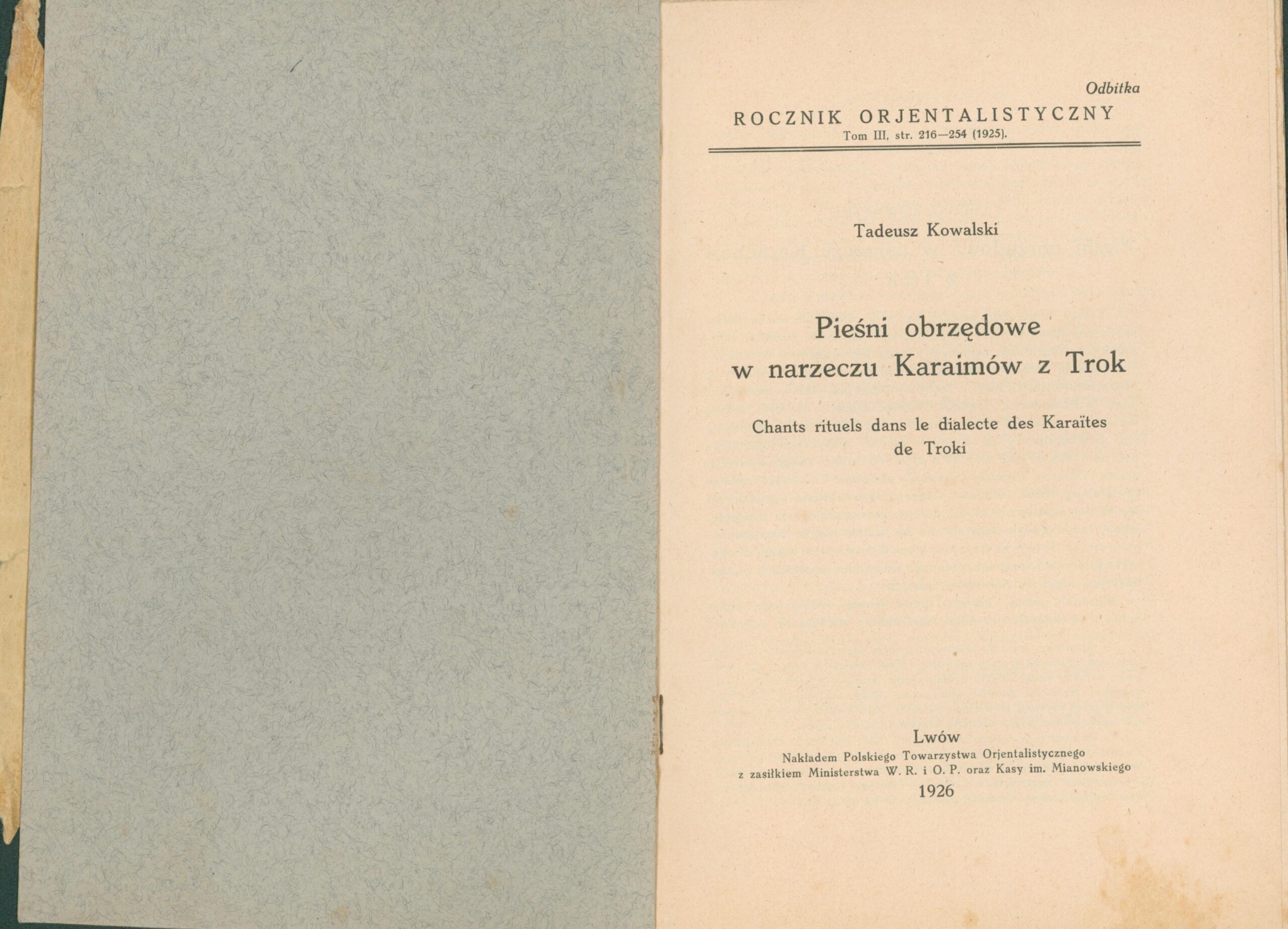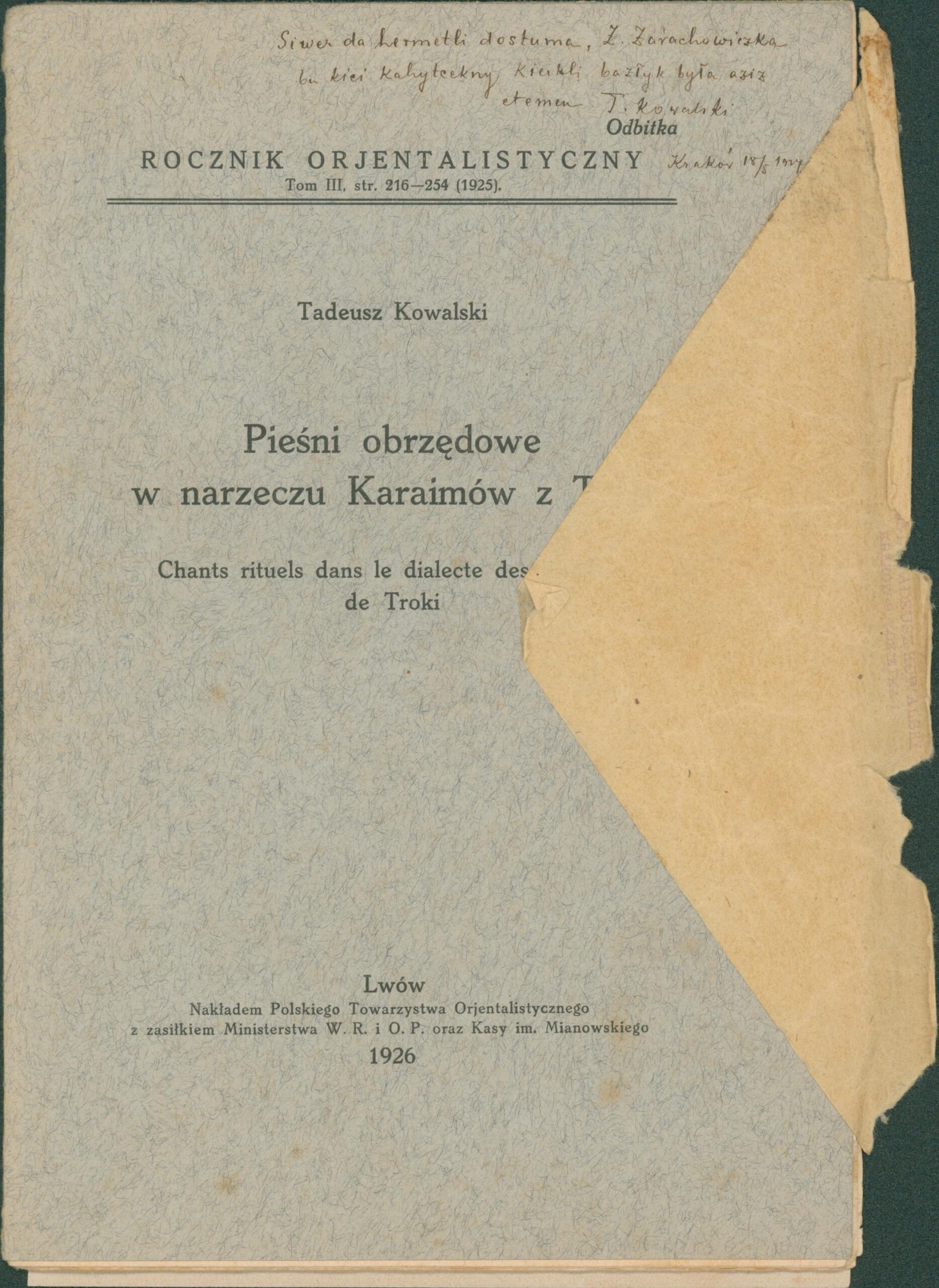Opis: List do Zaracha Zarachowicza od profesora Tadeusza Kowalskiego: odbitka artykułu Tadeusz Kowalski. Pieśni obrzędowe w narzeczu Karaimów z Trok. Rocznik Orjentalistyczny. Tom III, 1926 r.