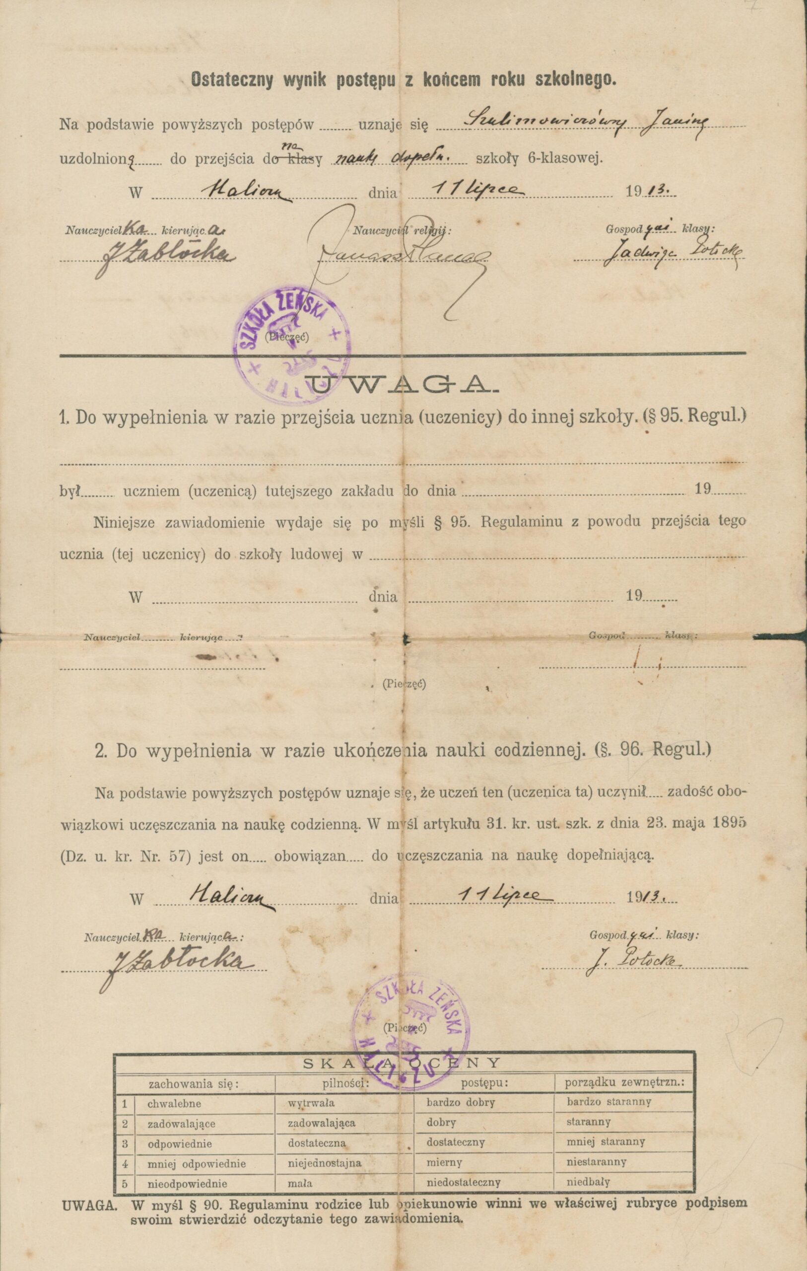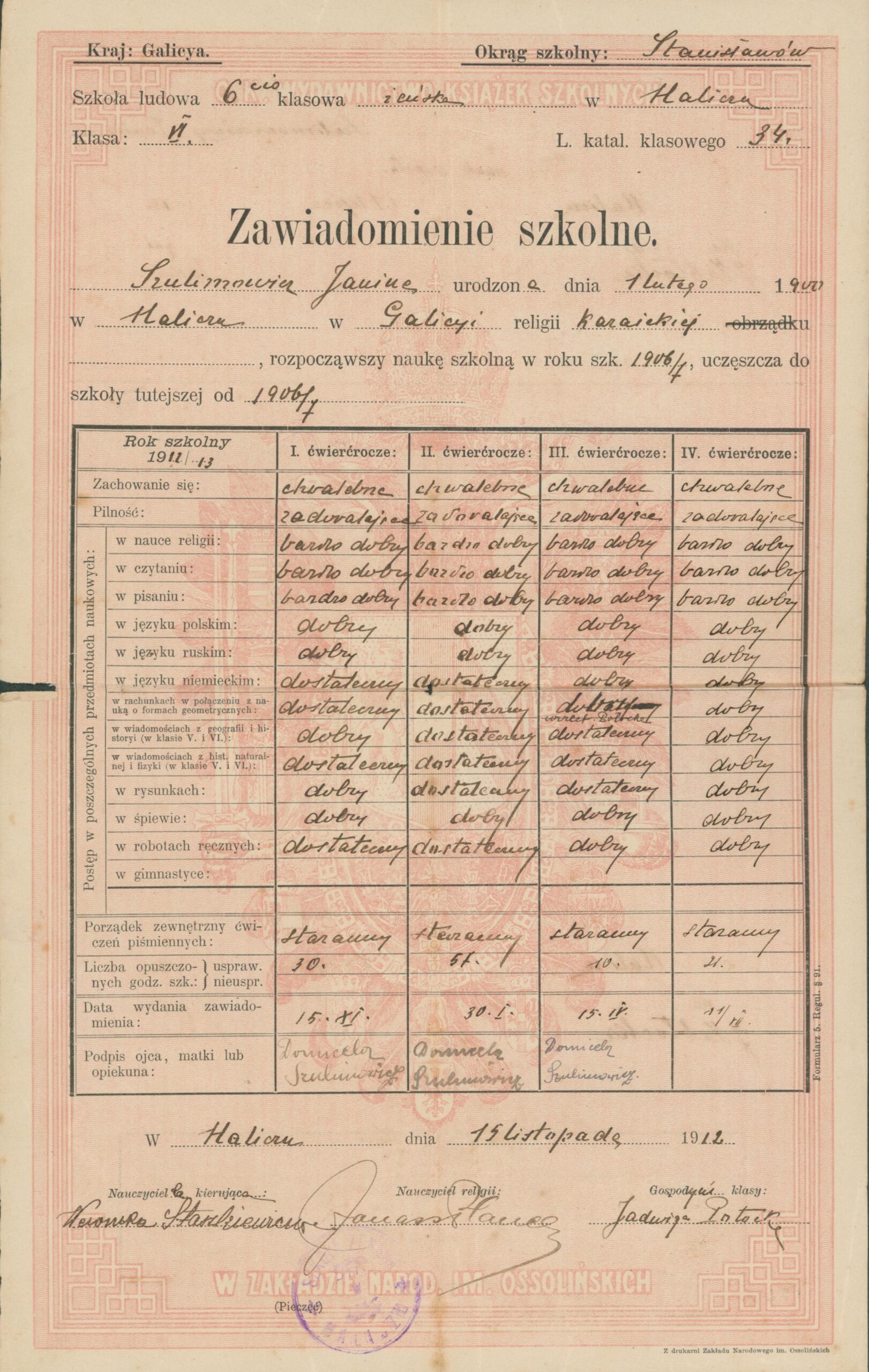 Опис: Шкільне свідоцтво за перше півріччя 1912-1913 навчального року Шулімович Яніни, народженої 1 лютого 1900 р. в Галичі, релігії караїмської, розпочала навчання у 1906-1907 р.