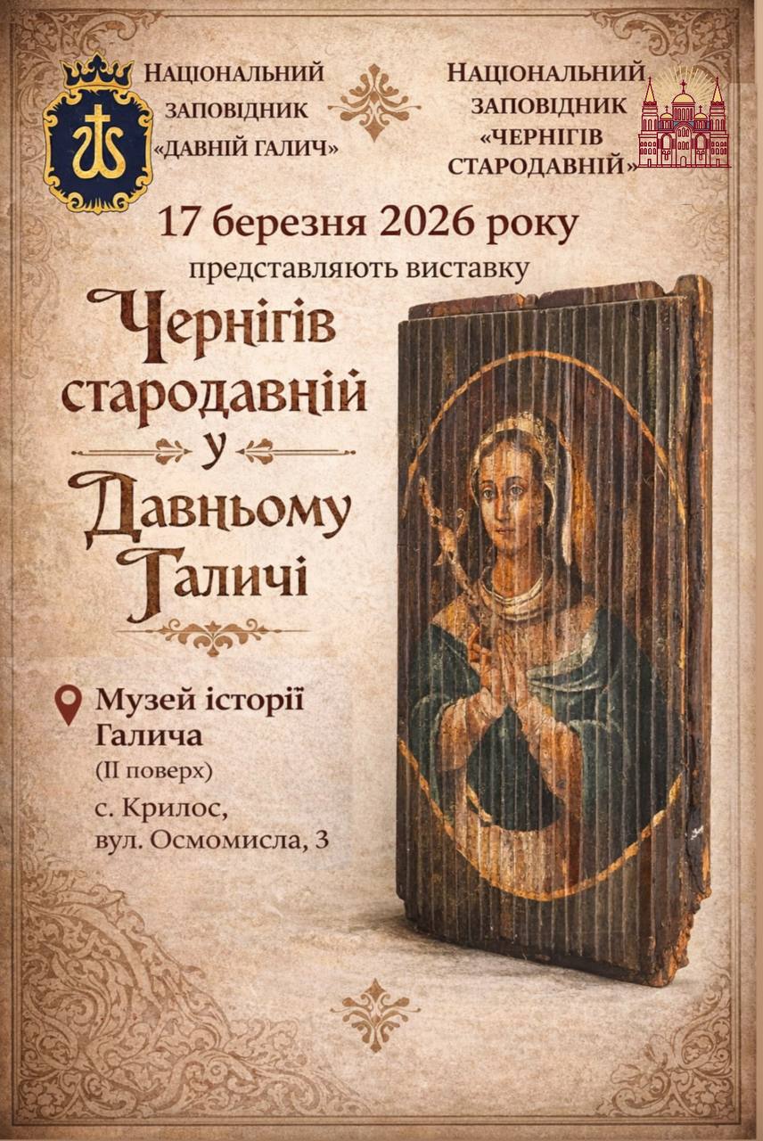 17 березня 2026 року у Музеї історії Галича, що на другому поверсі за адресою: с. Крилос, вул. Осмомисла, 3, відбудеться відкриття виставки «Чернігів стародавній».