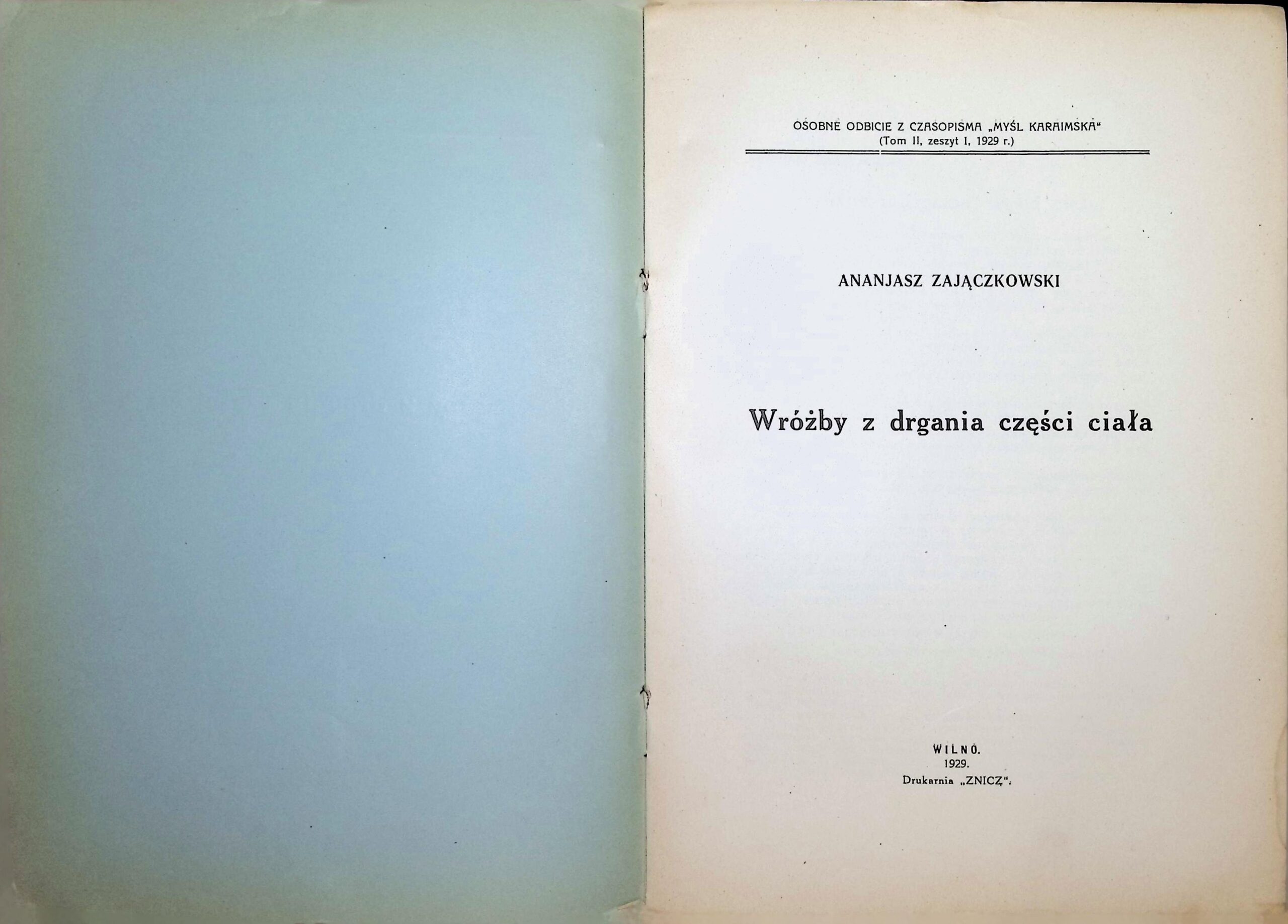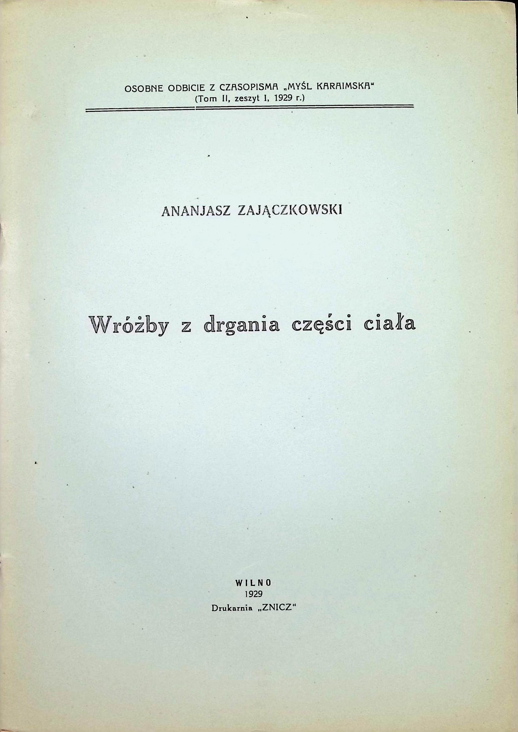 Ворожіння з тремтіння частин тіла Книги, Роки Назва: Ворожіння з тремтіння частин тіла Дата: 1929 р. Опис: Ананяш Заячковський. Ворожіння з тремтіння частин тіла. Вільно, 1929 р. Видруковано видавництвом «ZNICZ» Інвентарний номер: НЗДГ КН-6604 РКГ-701